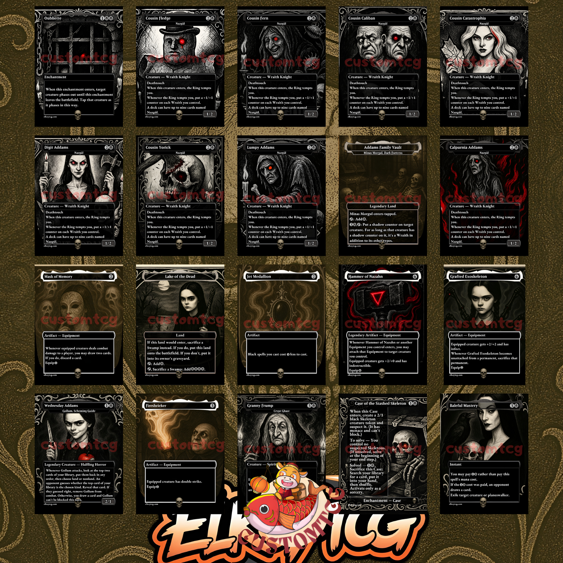 - Every card customized with Addams-style family members: Morticia, Gomez, Cousin Itt, Lurch, and even Granny Frump