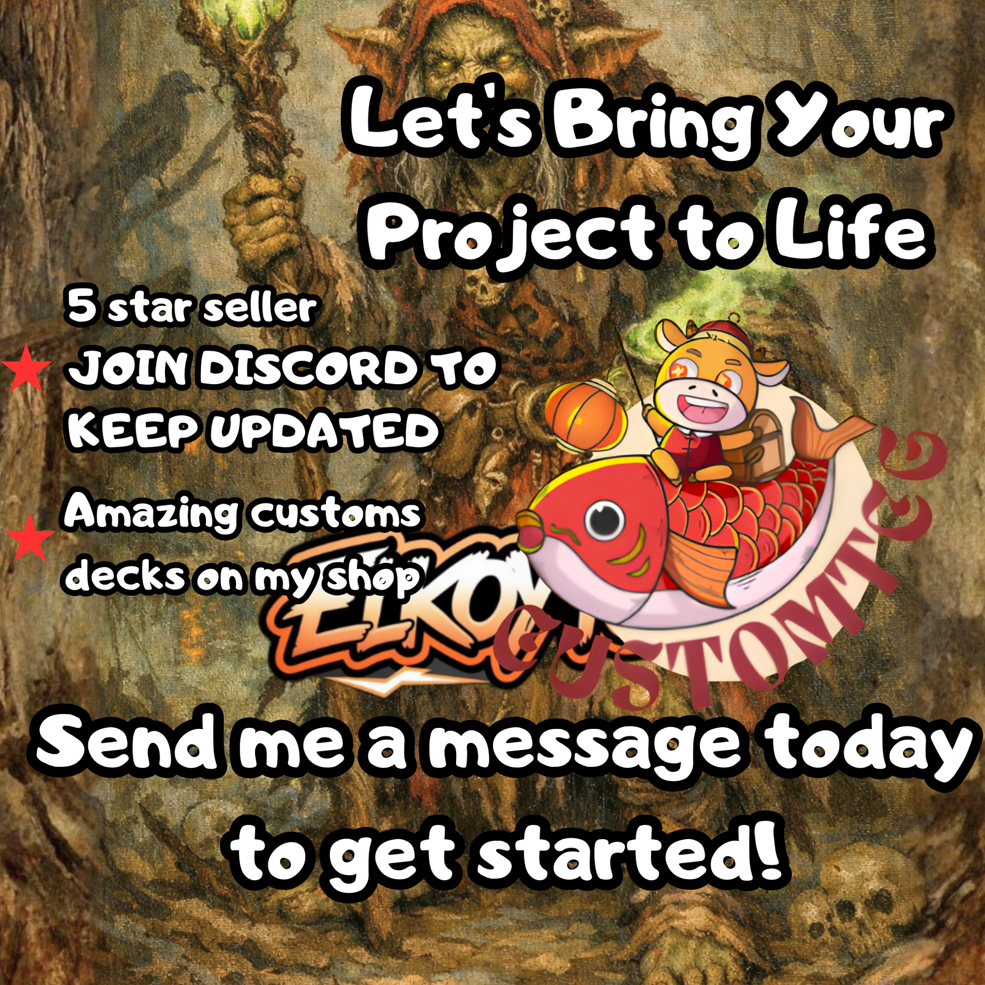 Our custom decks offer a truly unique experience, featuring fully frames, customized artwork, mana symbols, etc... designed to enhance the theme and style of each deck. Every card is meticulously crafted to provide a one-of-a-kind aesthetic while maintaining the quality you expect for seamless gameplay.