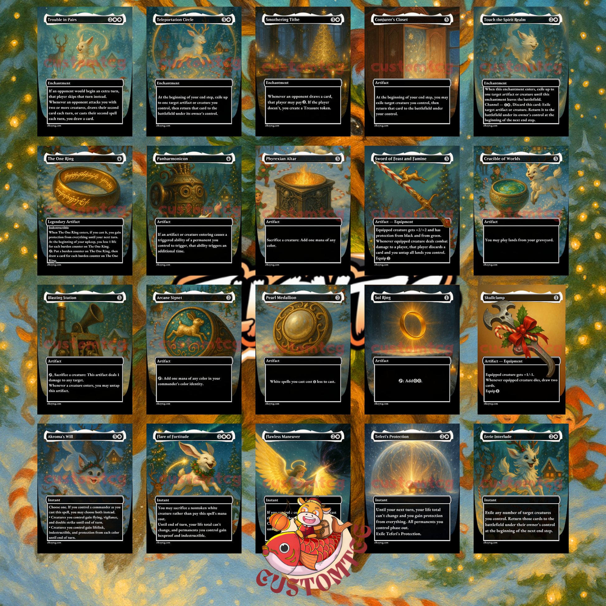 Your battlefield becomes a snow-lit winter forest filled with glowing lanterns, festive beasts, enchanted elk, joyful angels, and cozy holiday magic. Every card feels like a page from a fantasy storybook set during Christmas night.
