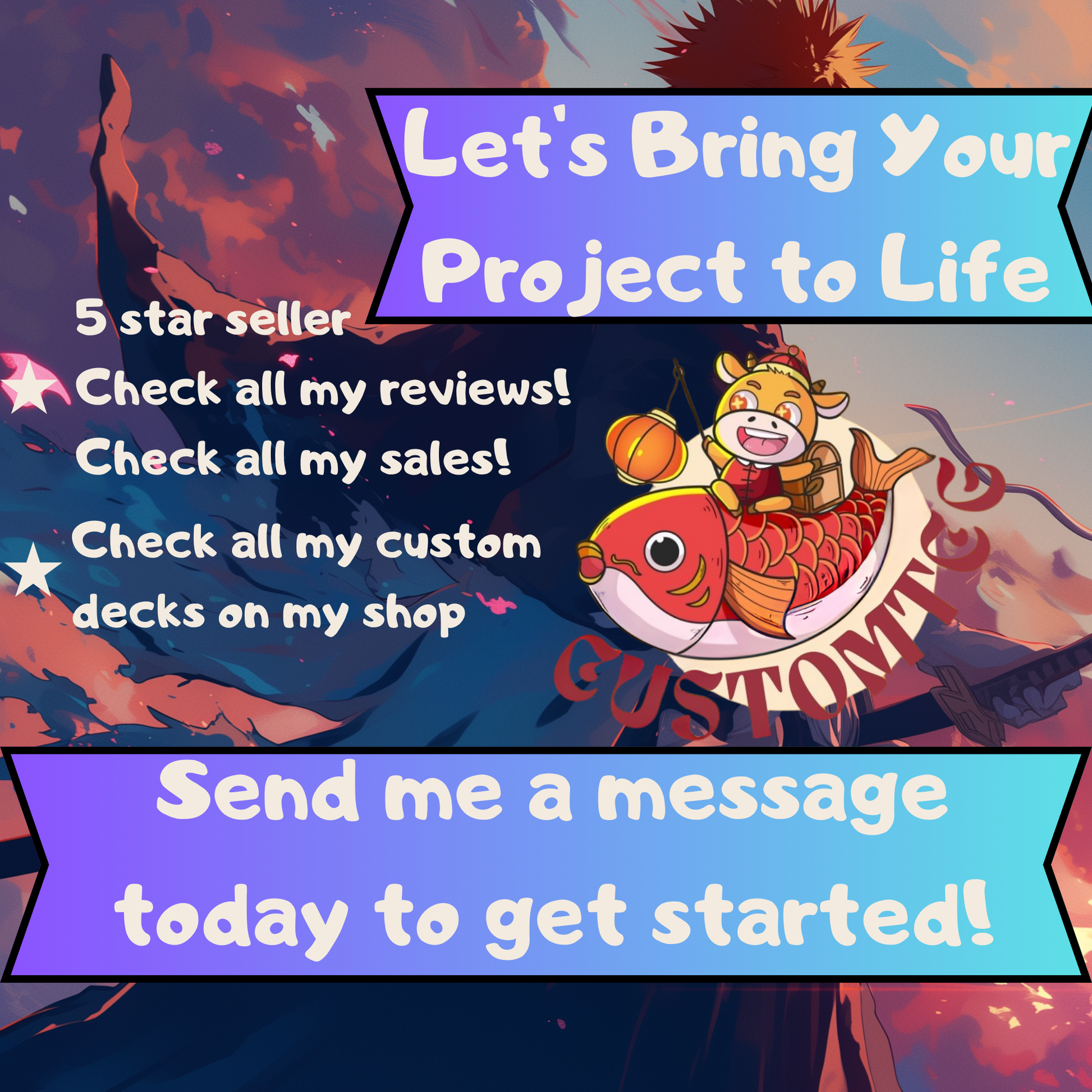 Our custom decks offer a truly unique experience, featuring fully frames, customized artwork, mana symbols, etc... designed to enhance the theme and style of each deck. Every card is meticulously crafted to provide a one-of-a-kind aesthetic while maintaining the quality you expect for seamless gameplay.