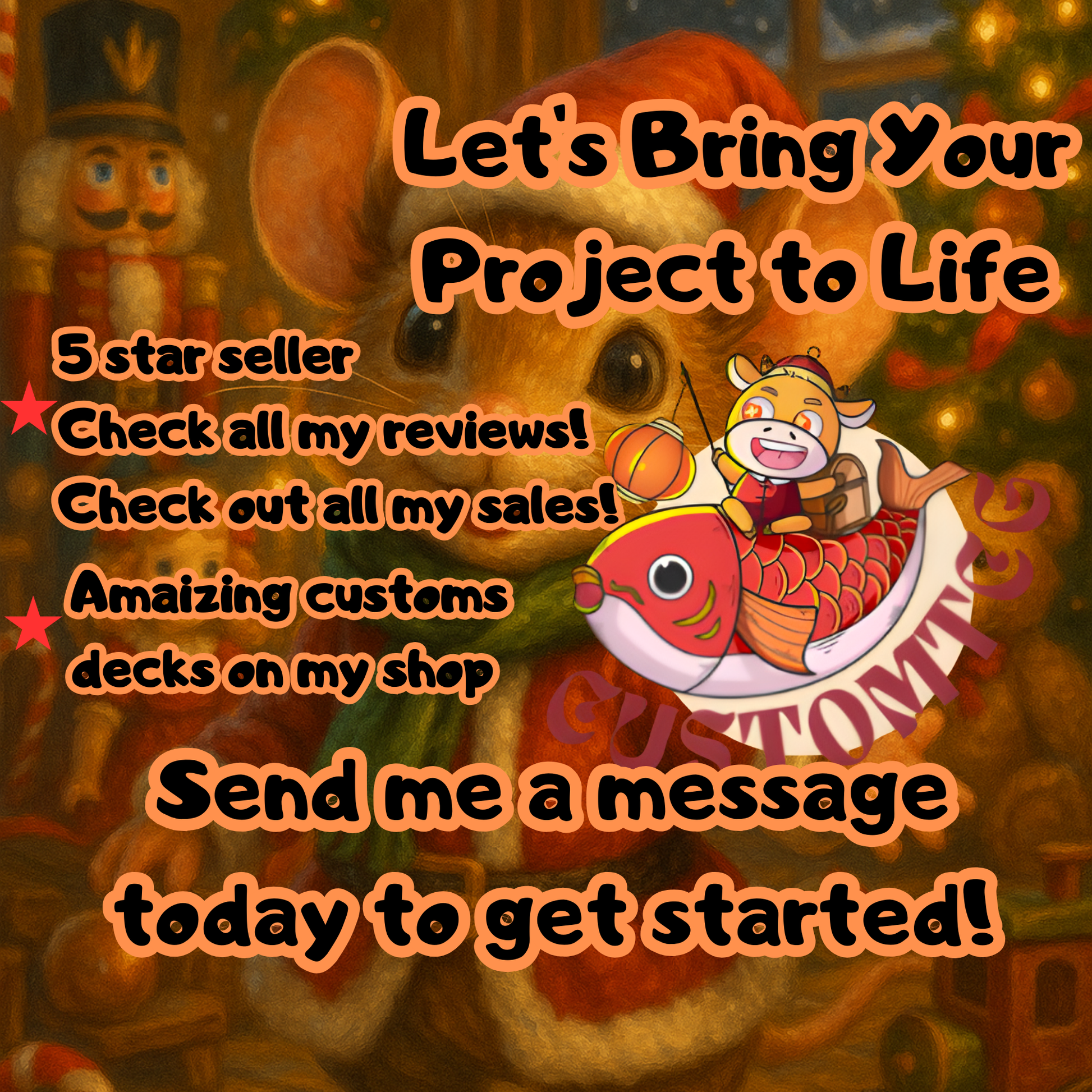 Our custom decks offer a truly unique experience, featuring fully frames, customized artwork, mana symbols, etc... designed to enhance the theme and style of each deck. Every card is meticulously crafted to provide a one-of-a-kind aesthetic while maintaining the quality you expect for seamless gameplay.