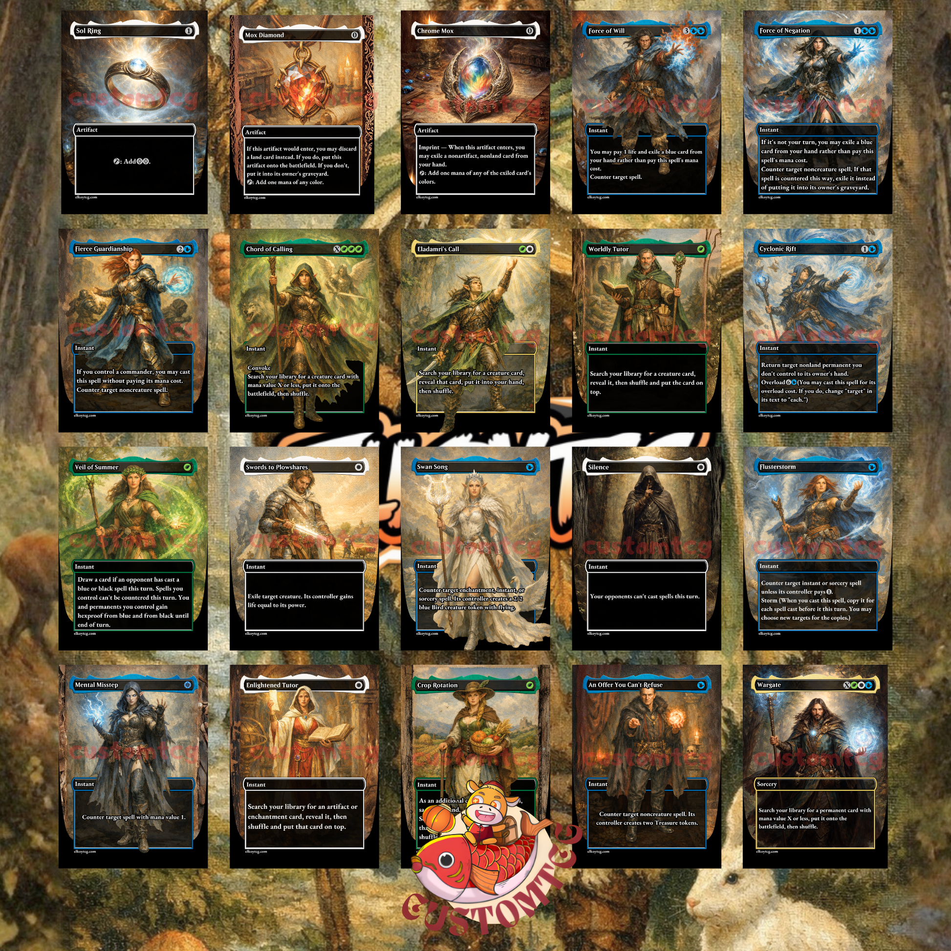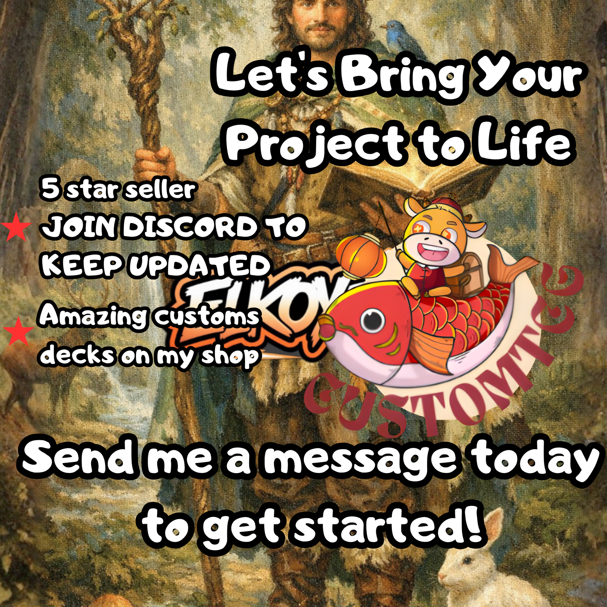 Our custom decks offer a truly unique experience, featuring fully frames, customized artwork, mana symbols, etc... designed to enhance the theme and style of each deck. Every card is meticulously crafted to provide a one-of-a-kind aesthetic while maintaining the quality you expect for seamless gameplay.