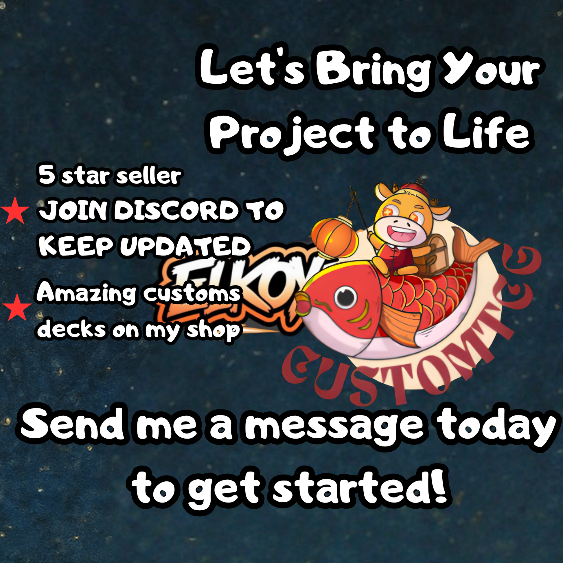 Our custom decks offer a truly unique experience, featuring fully frames, customized artwork, mana symbols, etc... designed to enhance the theme and style of each deck. Every card is meticulously crafted to provide a one-of-a-kind aesthetic while maintaining the quality you expect for seamless gameplay.