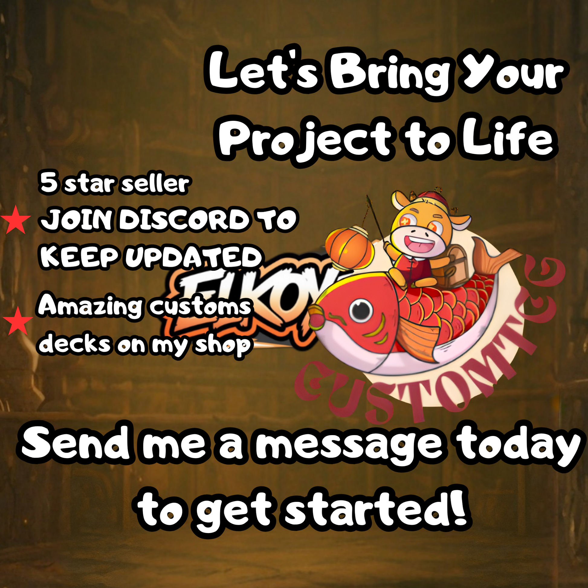 Our custom decks offer a truly unique experience, featuring fully frames, customized artwork, mana symbols, etc... designed to enhance the theme and style of each deck. Every card is meticulously crafted to provide a one-of-a-kind aesthetic while maintaining the quality you expect for seamless gameplay.