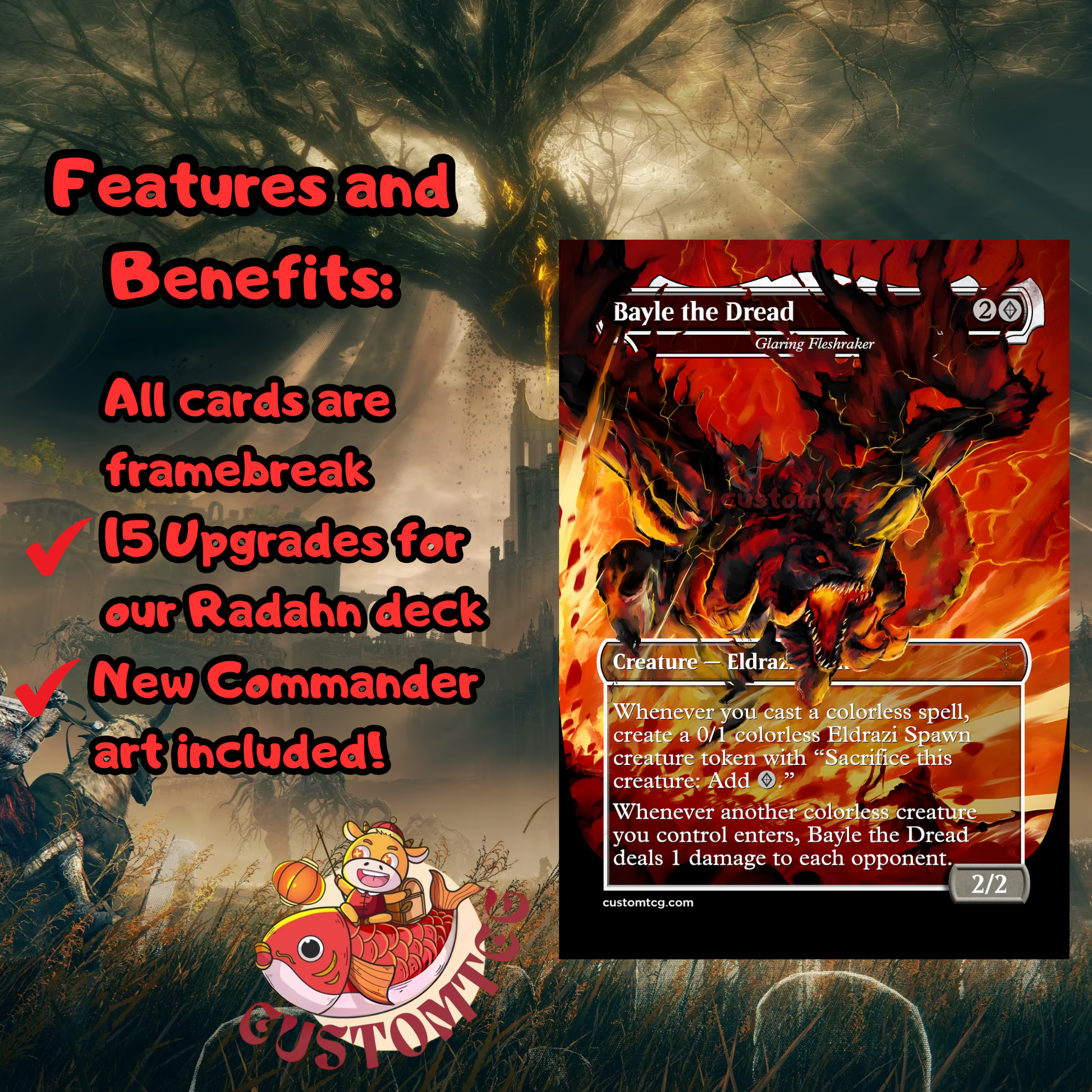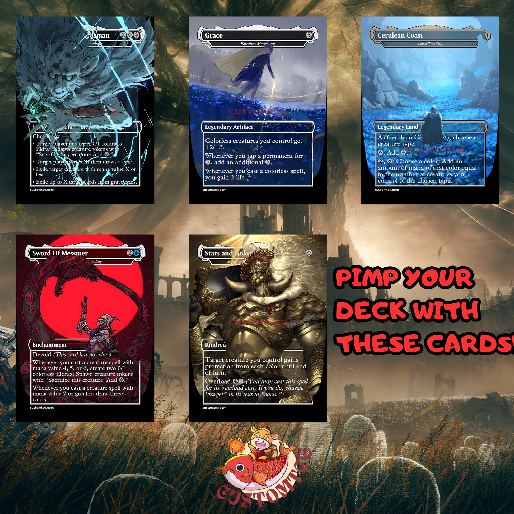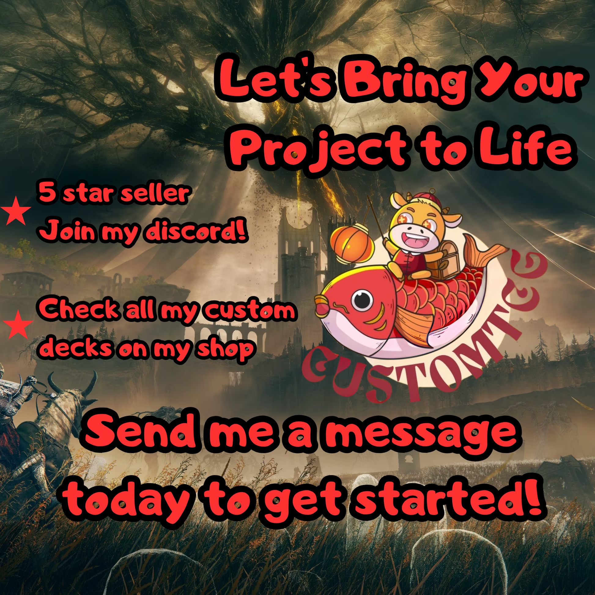 Our custom decks offer a truly unique experience, featuring fully frames, customized artwork, mana symbols, etc... designed to enhance the theme and style of each deck. Every card is meticulously crafted to provide a one-of-a-kind aesthetic while maintaining the quality you expect for seamless gameplay.