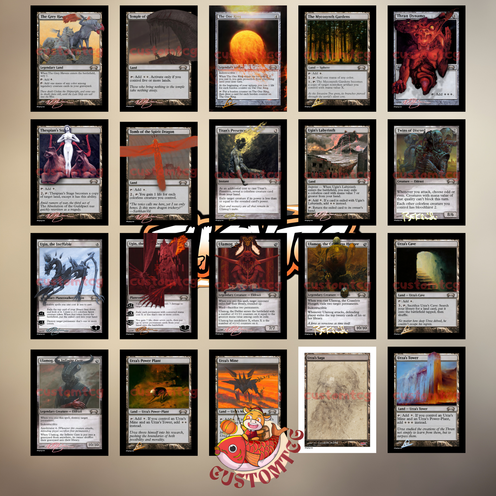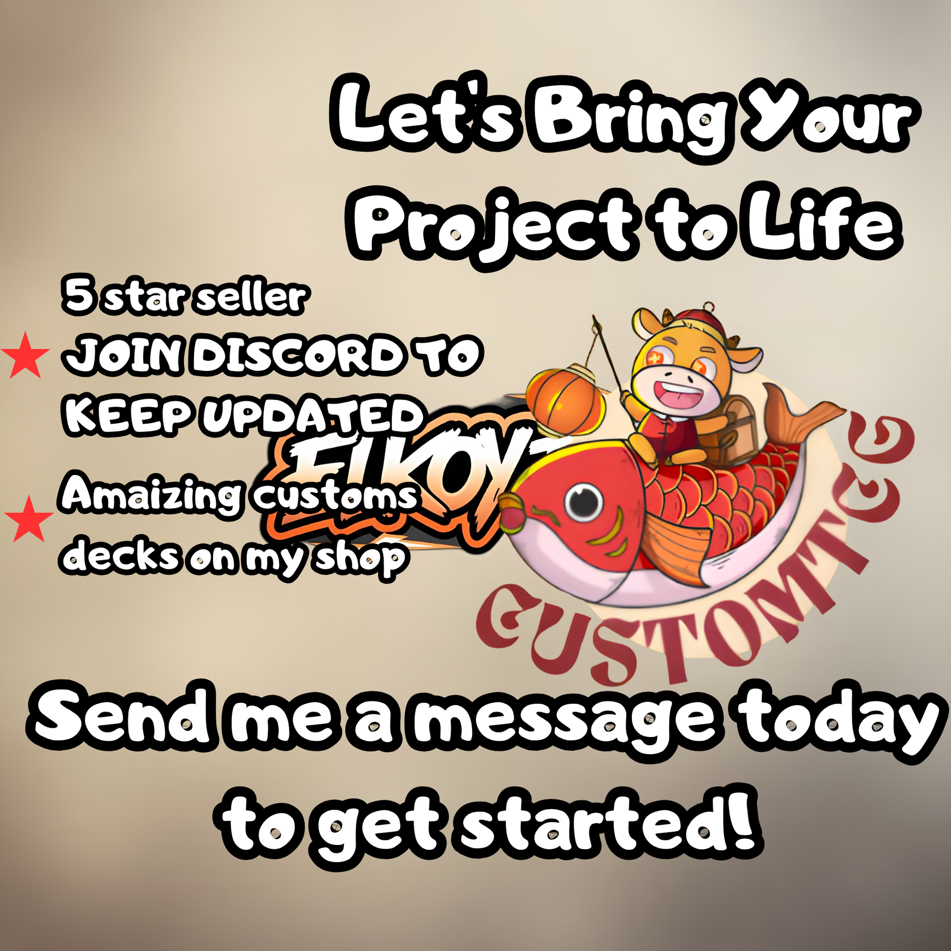 Our custom decks offer a truly unique experience, featuring fully frames, customized artwork, mana symbols, etc... designed to enhance the theme and style of each deck. Every card is meticulously crafted to provide a one-of-a-kind aesthetic while maintaining the quality you expect for seamless gameplay.