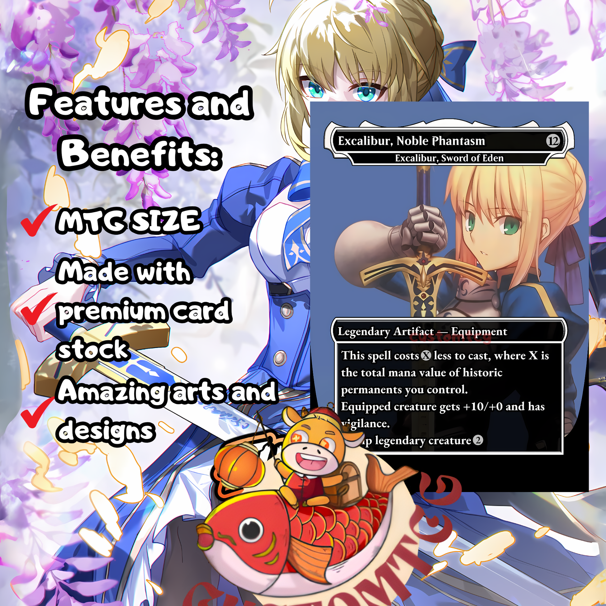 Our custom decks offer a truly unique experience, featuring fully frames, customized artwork, mana symbols, etc... designed to enhance the theme and style of each deck. Every card is meticulously crafted to provide a one-of-a-kind aesthetic while maintaining the quality you expect for seamless gameplay.