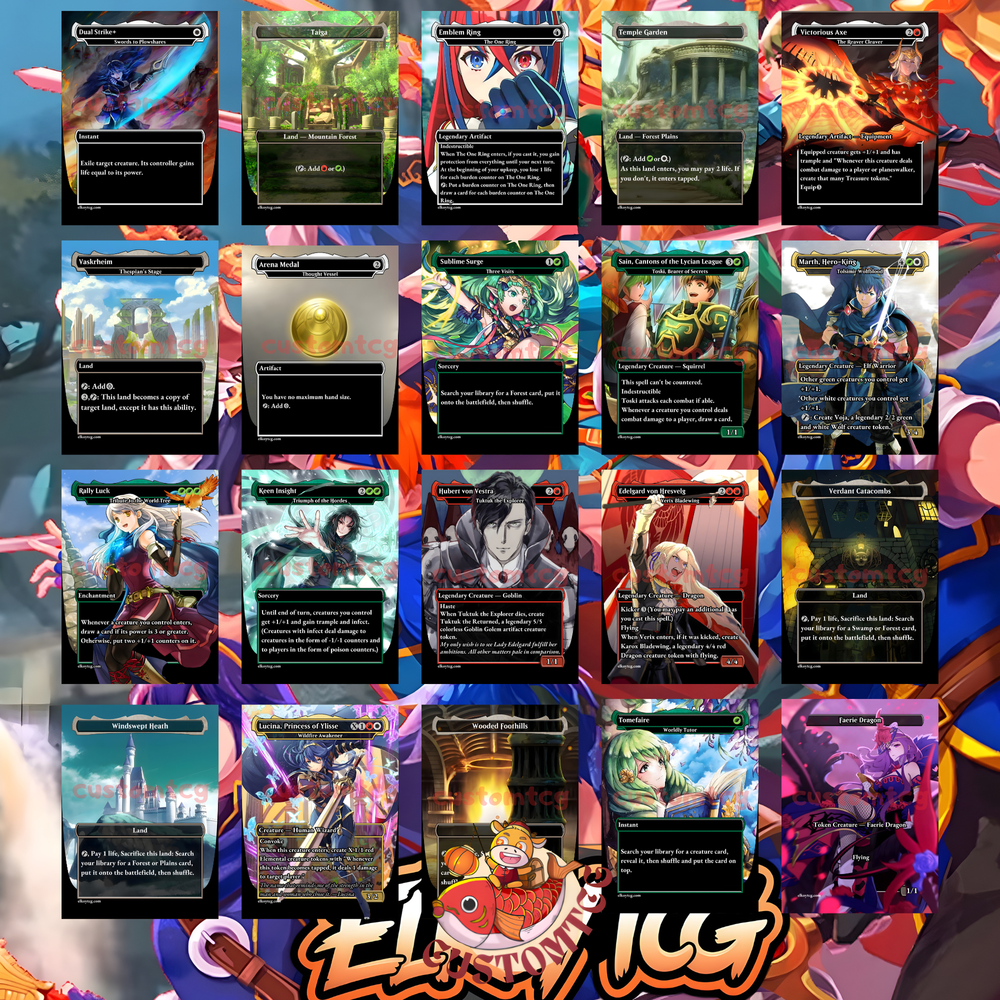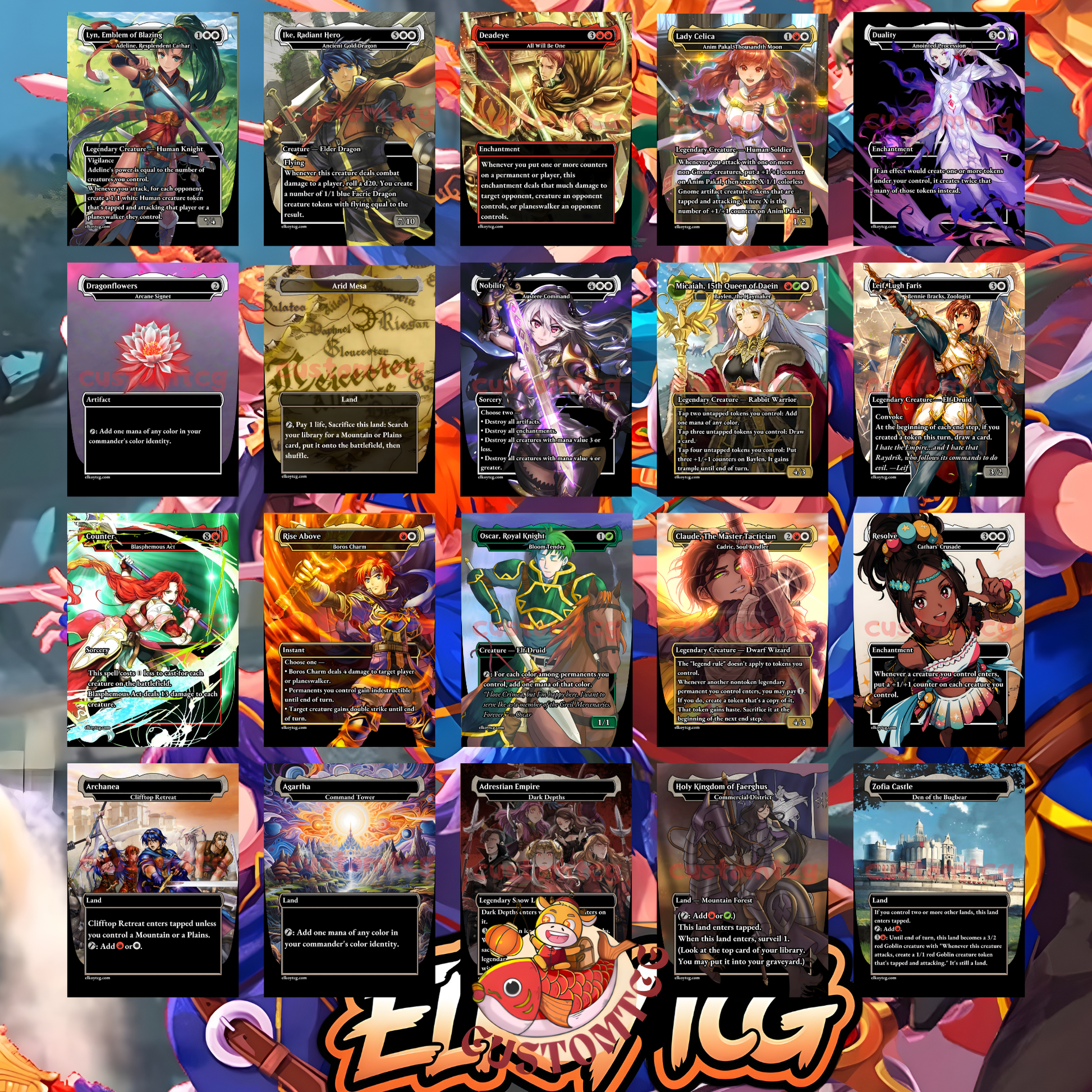 Our custom decks offer a truly unique experience, featuring fully frames, customized artwork, mana symbols, etc... designed to enhance the theme and style of each deck. Every card is meticulously crafted to provide a one-of-a-kind aesthetic while maintaining the quality you expect for seamless gameplay.
