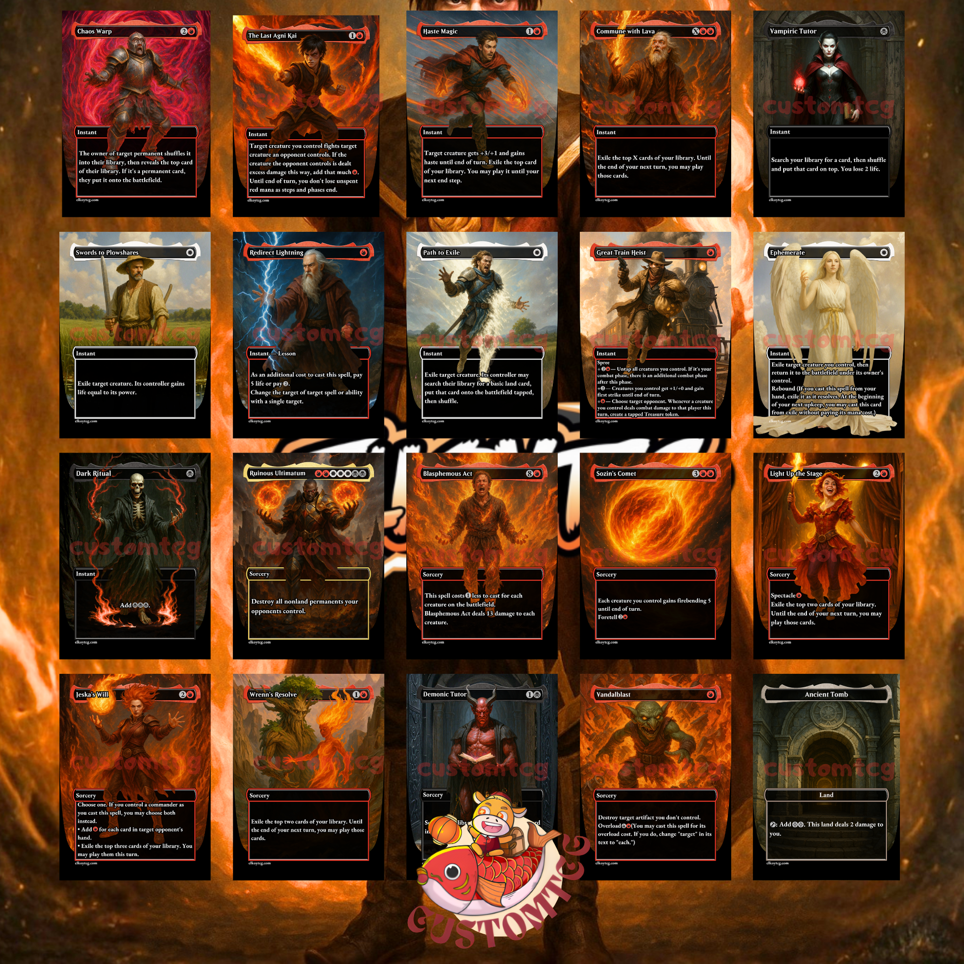 This deck blends premium-quality custom cards, a coherent fantasy art style, and a carefully curated list valued at over $2000 to create one of the most powerful and spectacular red-based decks available.
