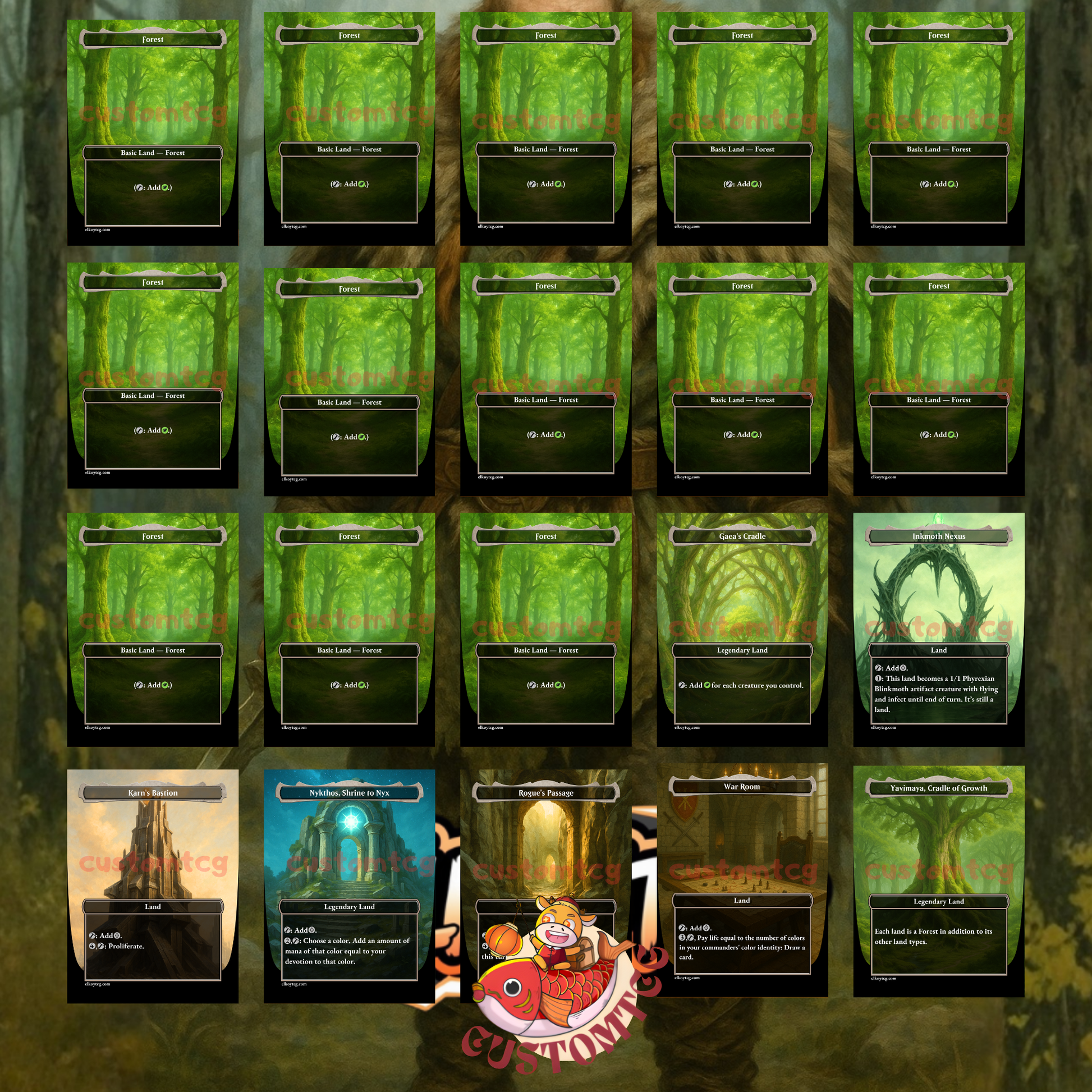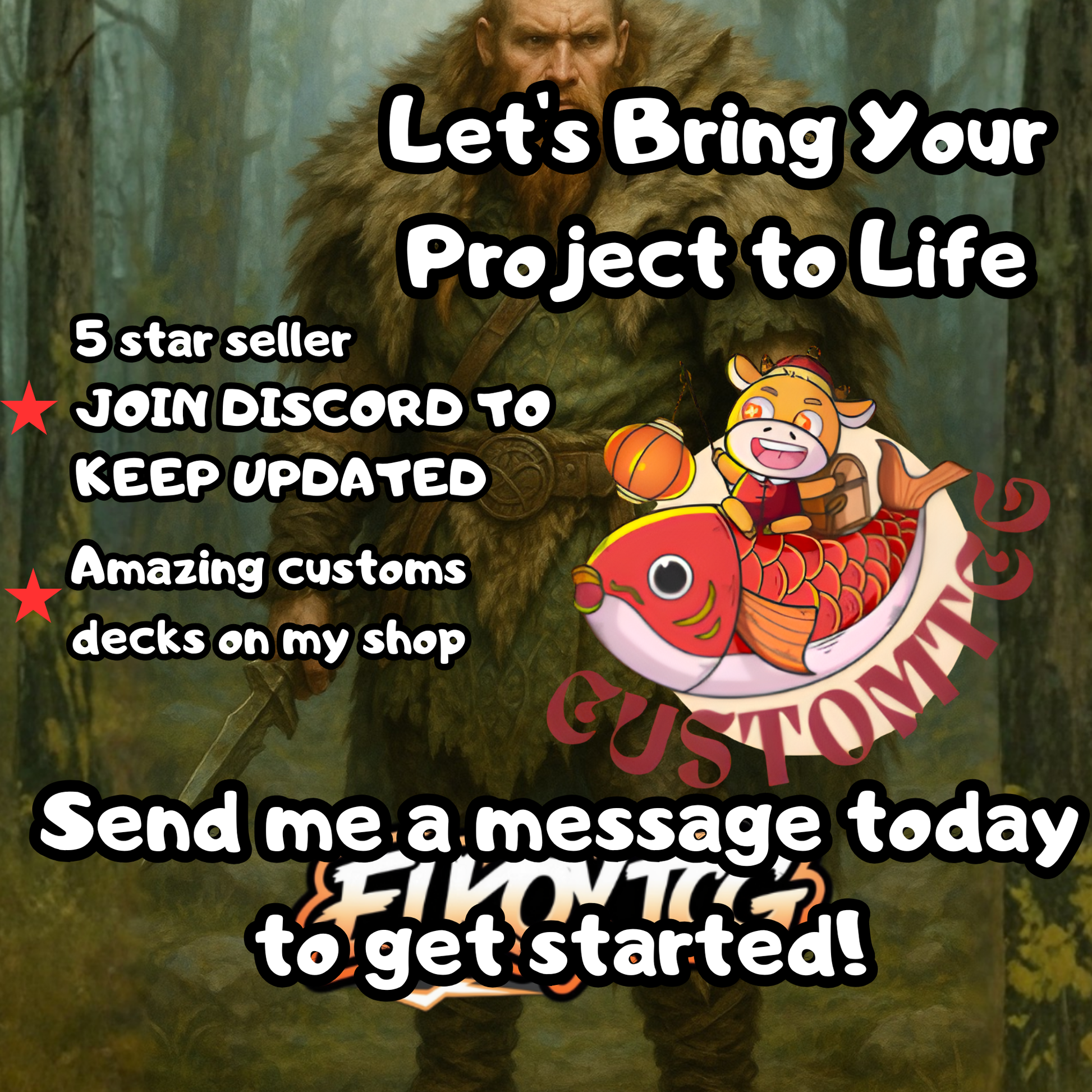 Our custom decks offer a truly unique experience, featuring fully frames, customized artwork, mana symbols, etc... designed to enhance the theme and style of each deck. Every card is meticulously crafted to provide a one-of-a-kind aesthetic while maintaining the quality you expect for seamless gameplay.