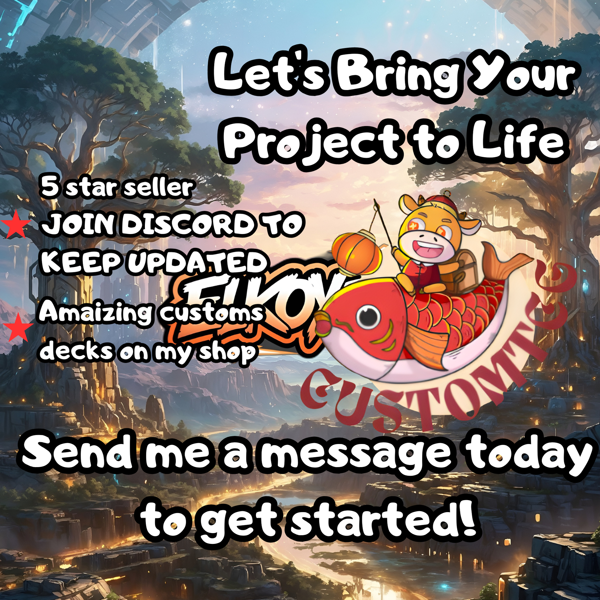 Our custom decks offer a truly unique experience, featuring fully frames, customized artwork, mana symbols, etc... designed to enhance the theme and style of each deck. Every card is meticulously crafted to provide a one-of-a-kind aesthetic while maintaining the quality you expect for seamless gameplay.