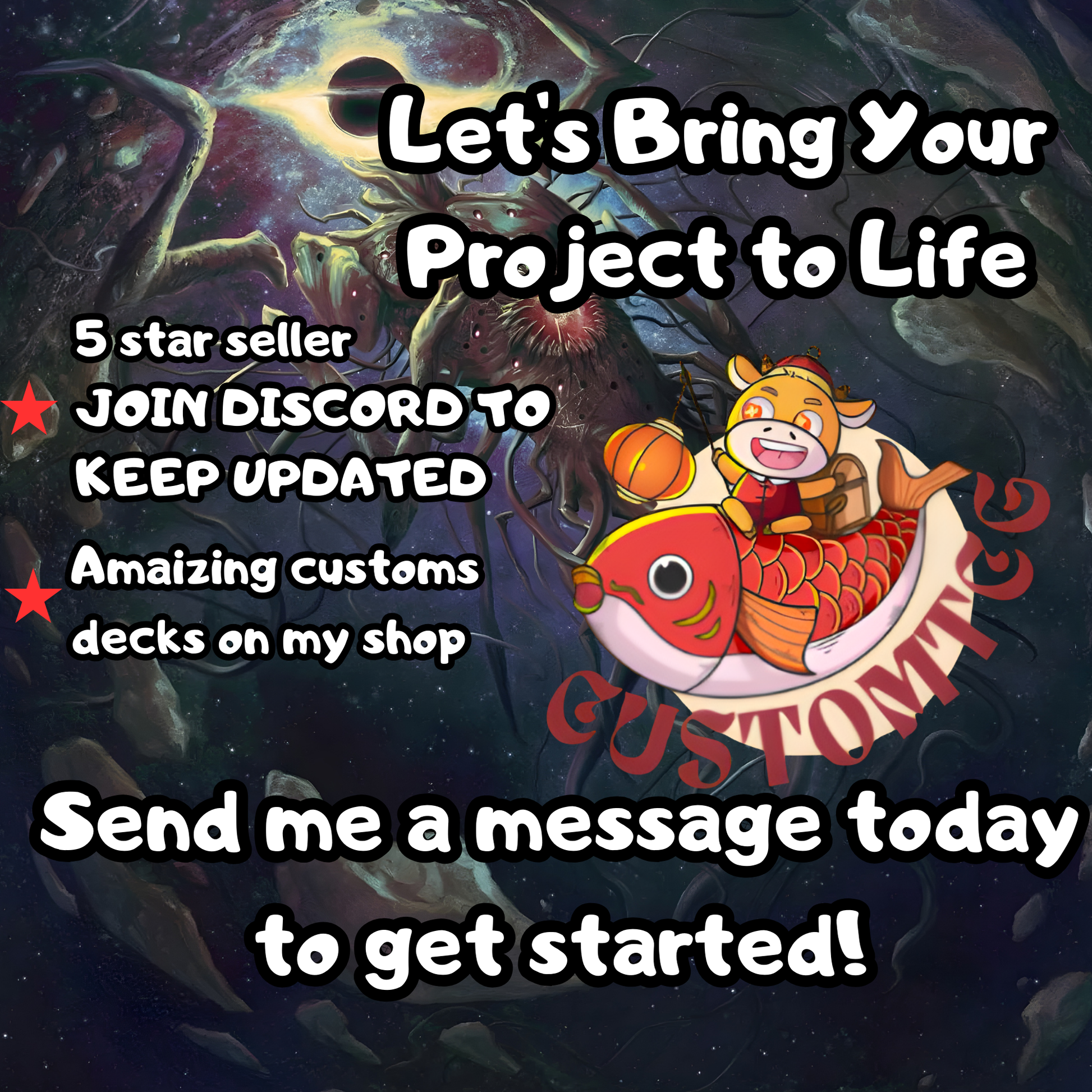 Our custom decks offer a truly unique experience, featuring fully frames, customized artwork, mana symbols, etc... designed to enhance the theme and style of each deck. Every card is meticulously crafted to provide a one-of-a-kind aesthetic while maintaining the quality you expect for seamless gameplay.