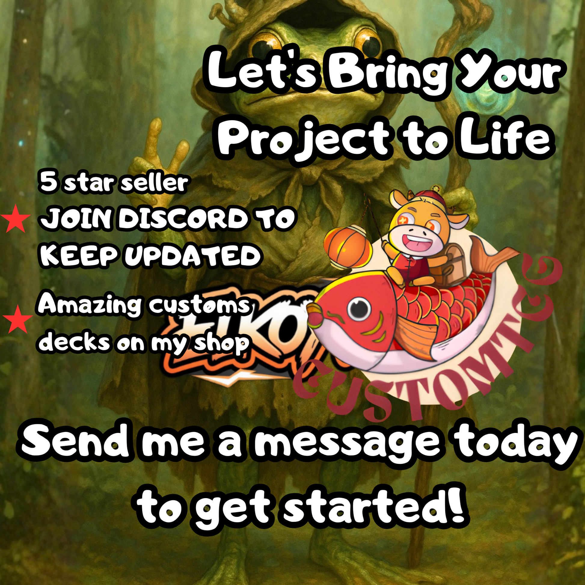 Our custom decks offer a truly unique experience, featuring fully frames, customized artwork, mana symbols, etc... designed to enhance the theme and style of each deck. Every card is meticulously crafted to provide a one-of-a-kind aesthetic while maintaining the quality you expect for seamless gameplay.