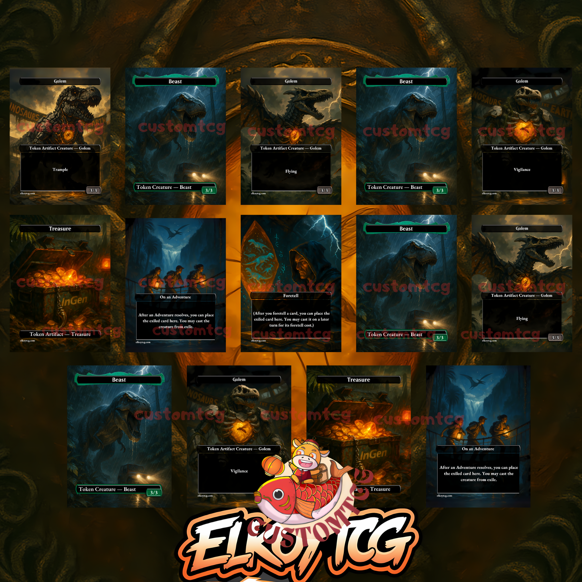- Token Pack 🦕: 3/3 Dino Beasts, T-Rex Golem constructs (trample / flying / vigilance variants) and glowing InGen Treasure crates for every line you’ll play.