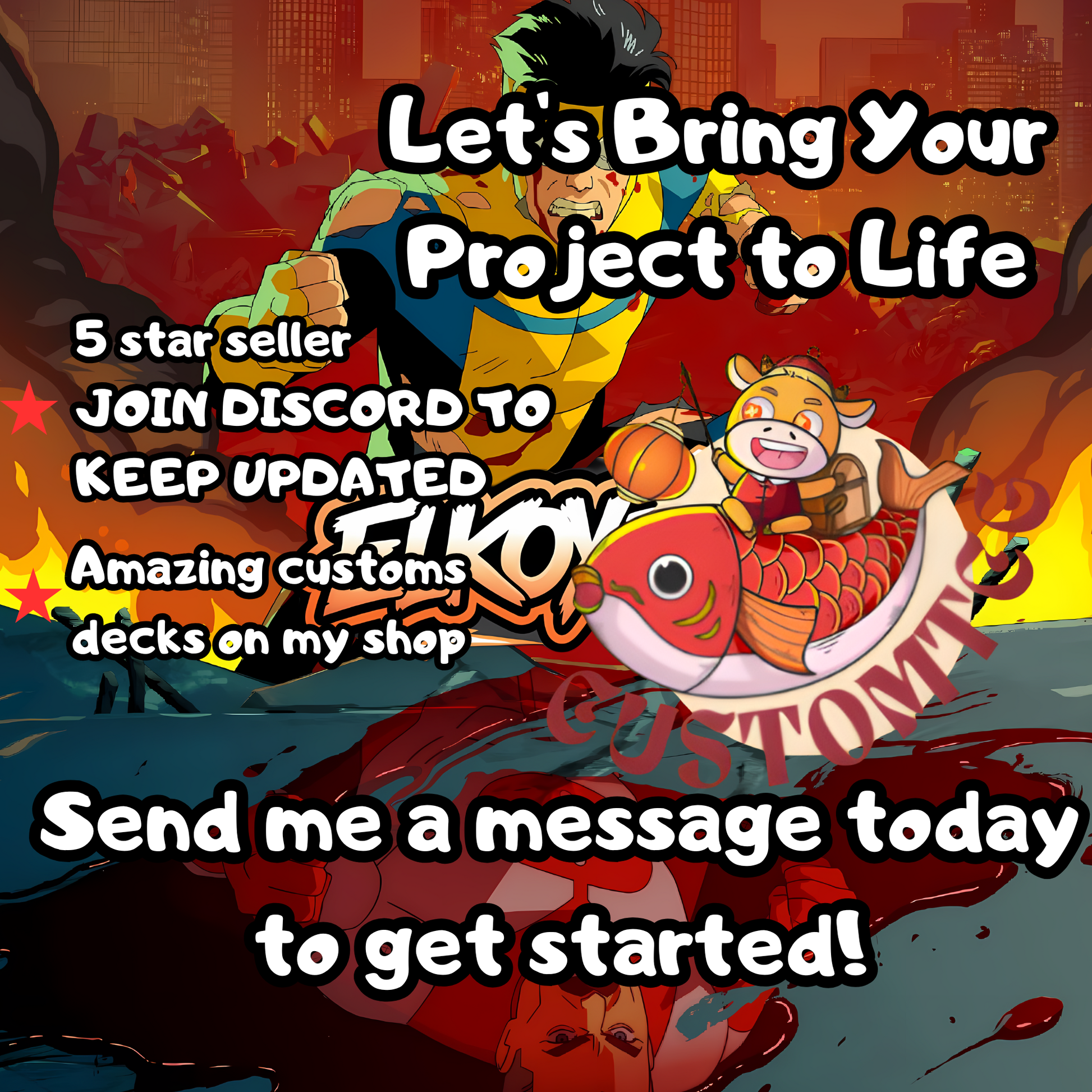 Our custom decks offer a truly unique experience, featuring fully frames, customized artwork, mana symbols, etc... designed to enhance the theme and style of each deck. Every card is meticulously crafted to provide a one-of-a-kind aesthetic while maintaining the quality you expect for seamless gameplay.