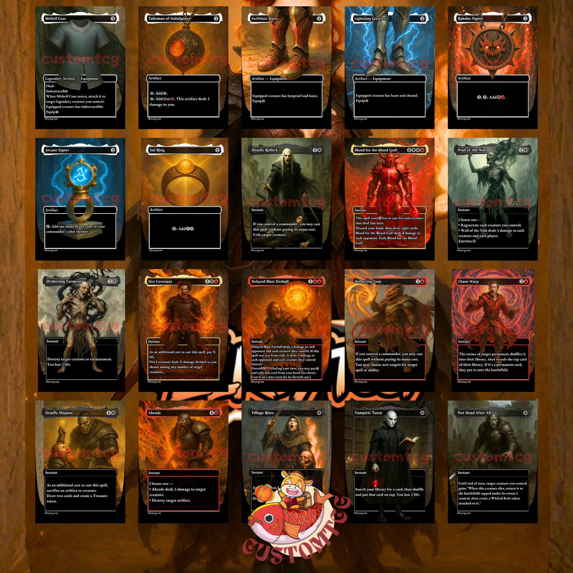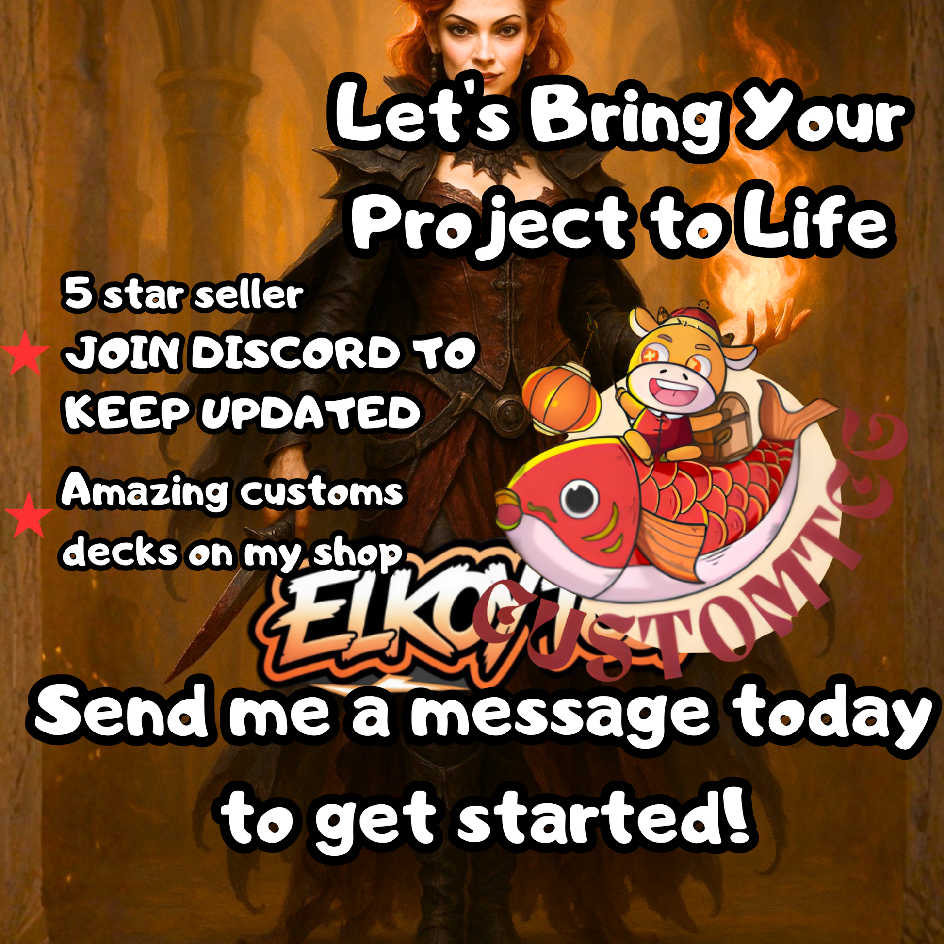 Our custom decks offer a truly unique experience, featuring fully frames, customized artwork, mana symbols, etc... designed to enhance the theme and style of each deck. Every card is meticulously crafted to provide a one-of-a-kind aesthetic while maintaining the quality you expect for seamless gameplay.