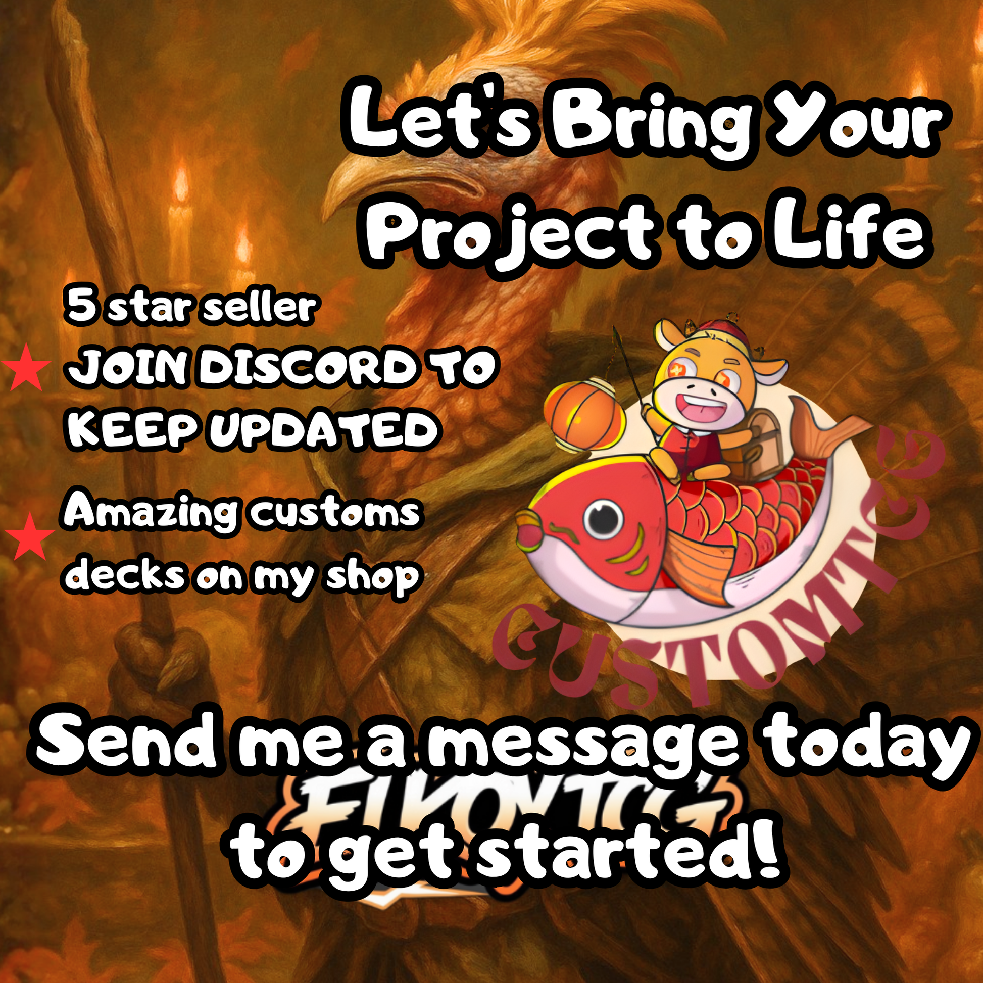 Our custom decks offer a truly unique experience, featuring fully frames, customized artwork, mana symbols, etc... designed to enhance the theme and style of each deck. Every card is meticulously crafted to provide a one-of-a-kind aesthetic while maintaining the quality you expect for seamless gameplay.