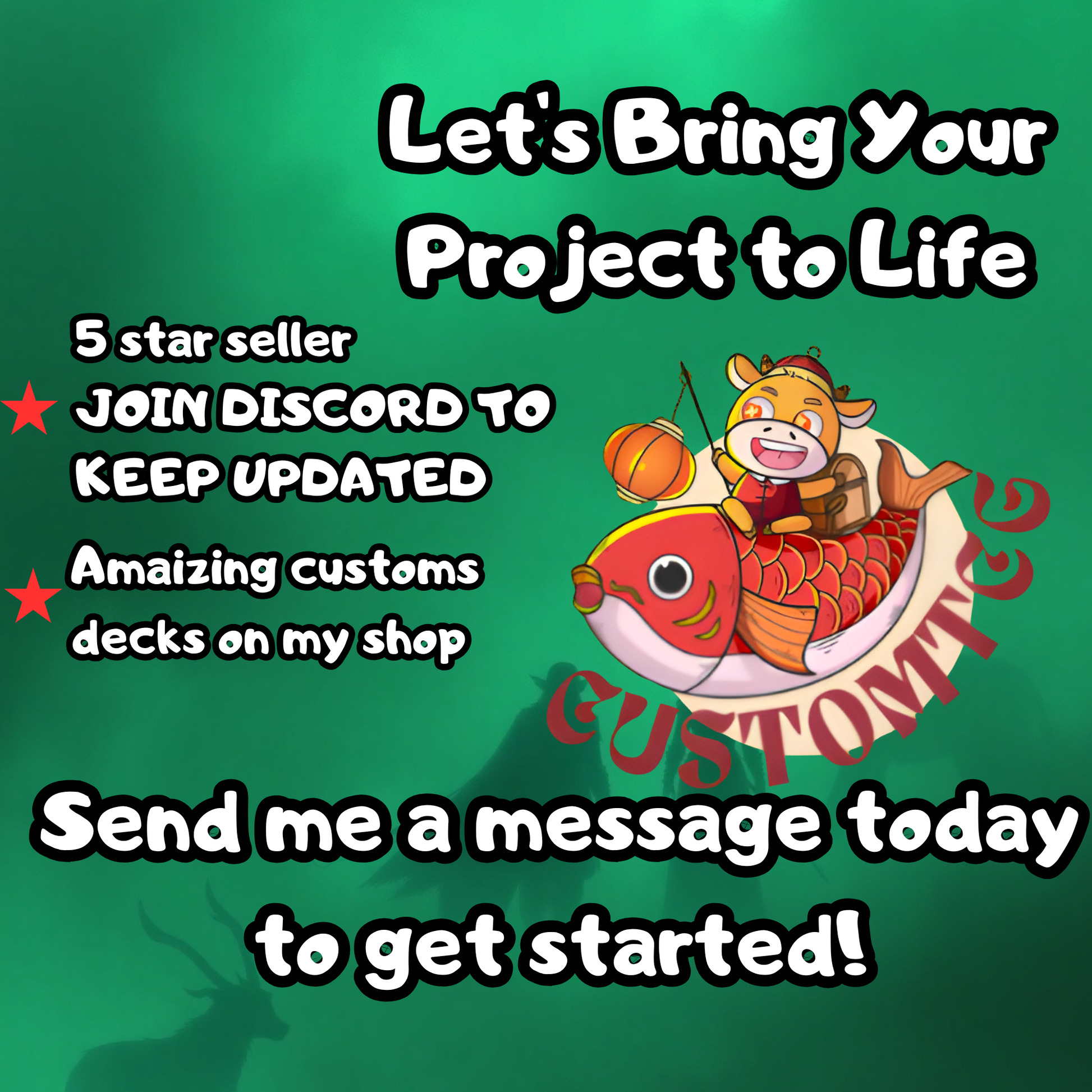 Our custom decks offer a truly unique experience, featuring fully frames, customized artwork, mana symbols, etc... designed to enhance the theme and style of each deck. Every card is meticulously crafted to provide a one-of-a-kind aesthetic while maintaining the quality you expect for seamless gameplay.