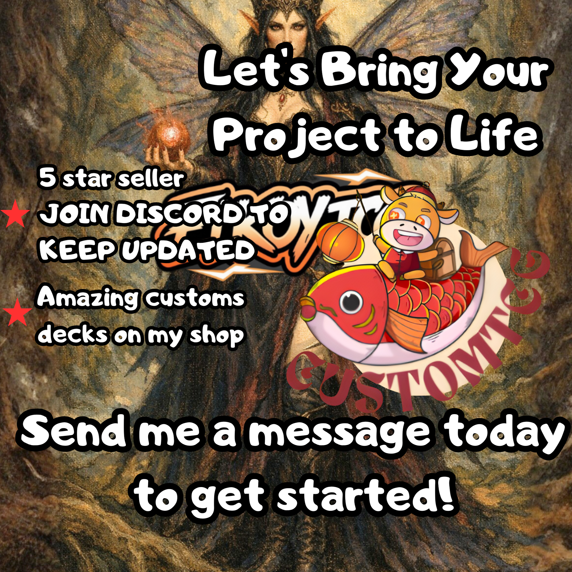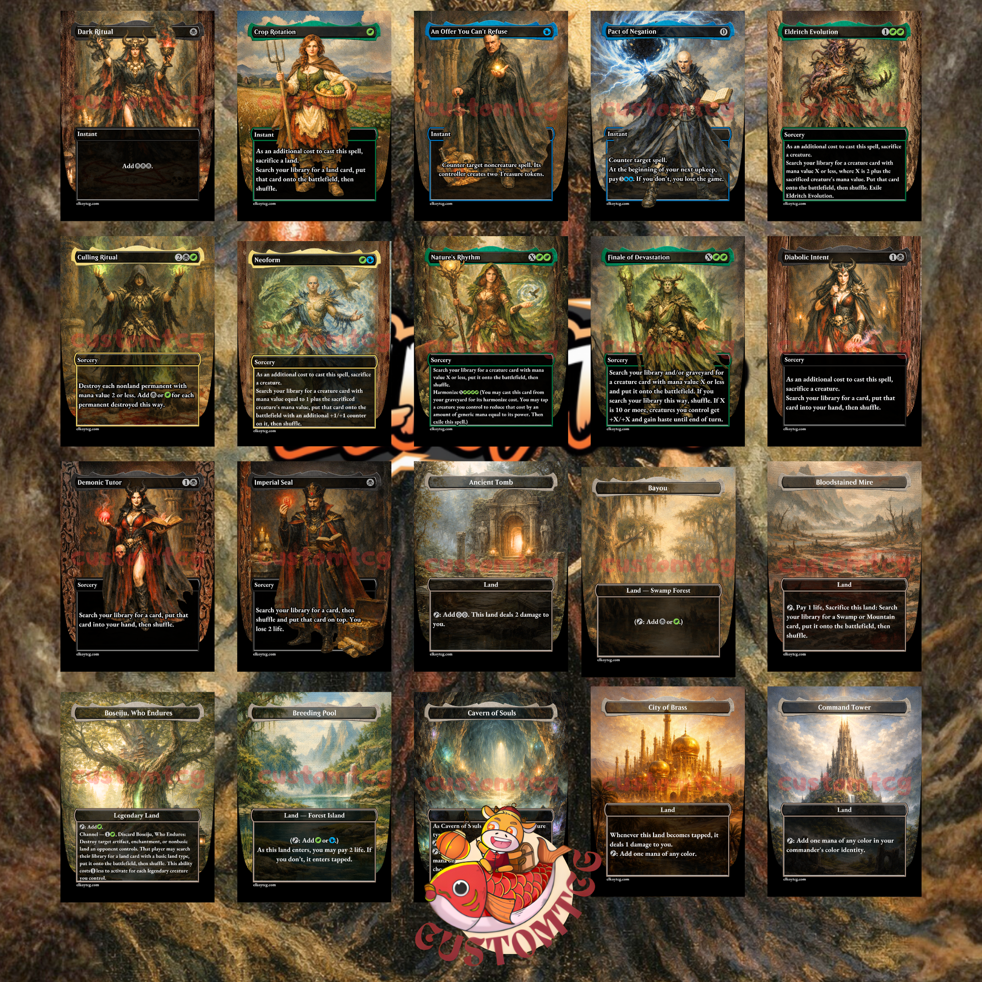 Our custom decks offer a truly unique experience, featuring fully frames, customized artwork, mana symbols, etc... designed to enhance the theme and style of each deck. Every card is meticulously crafted to provide a one-of-a-kind aesthetic while maintaining the quality you expect for seamless gameplay.