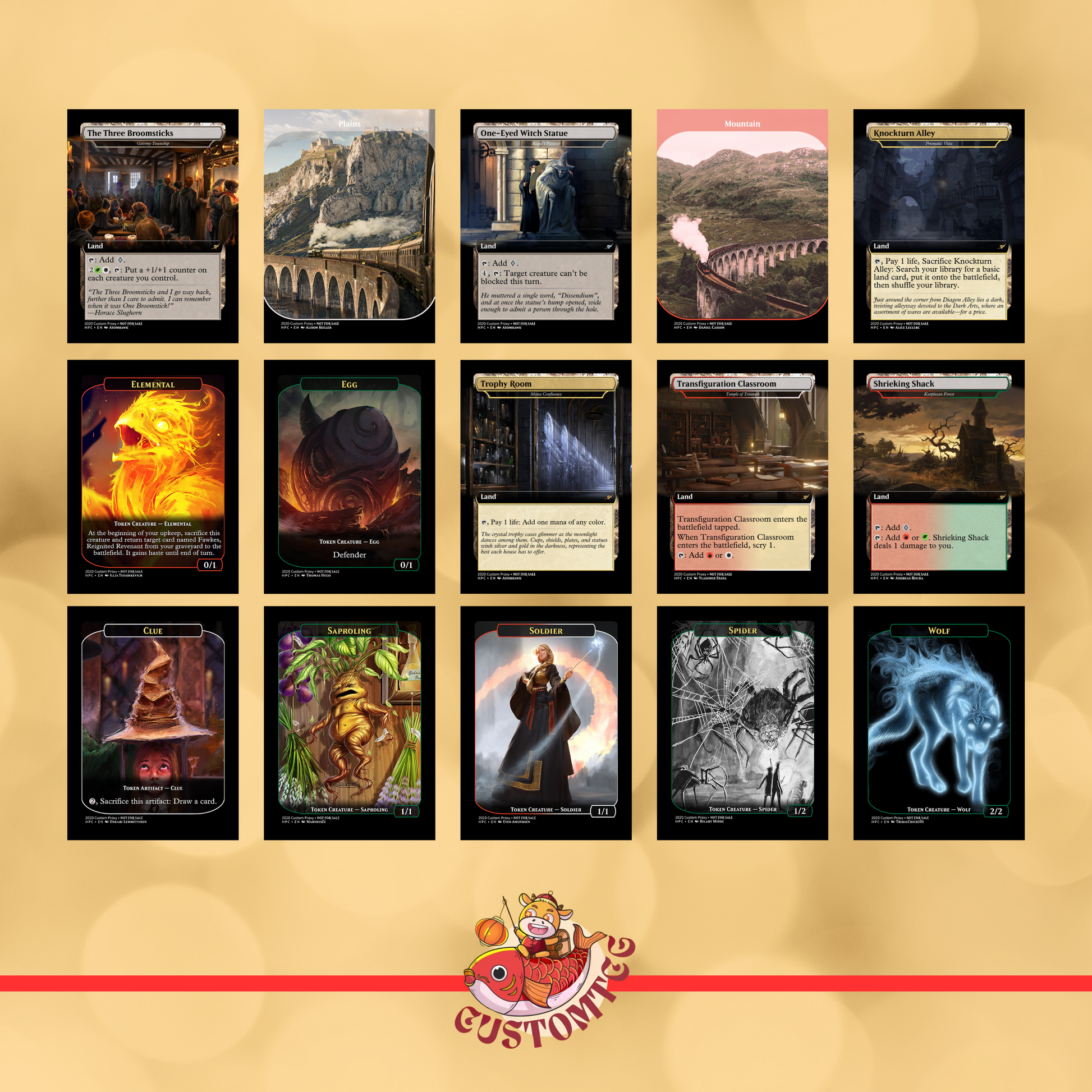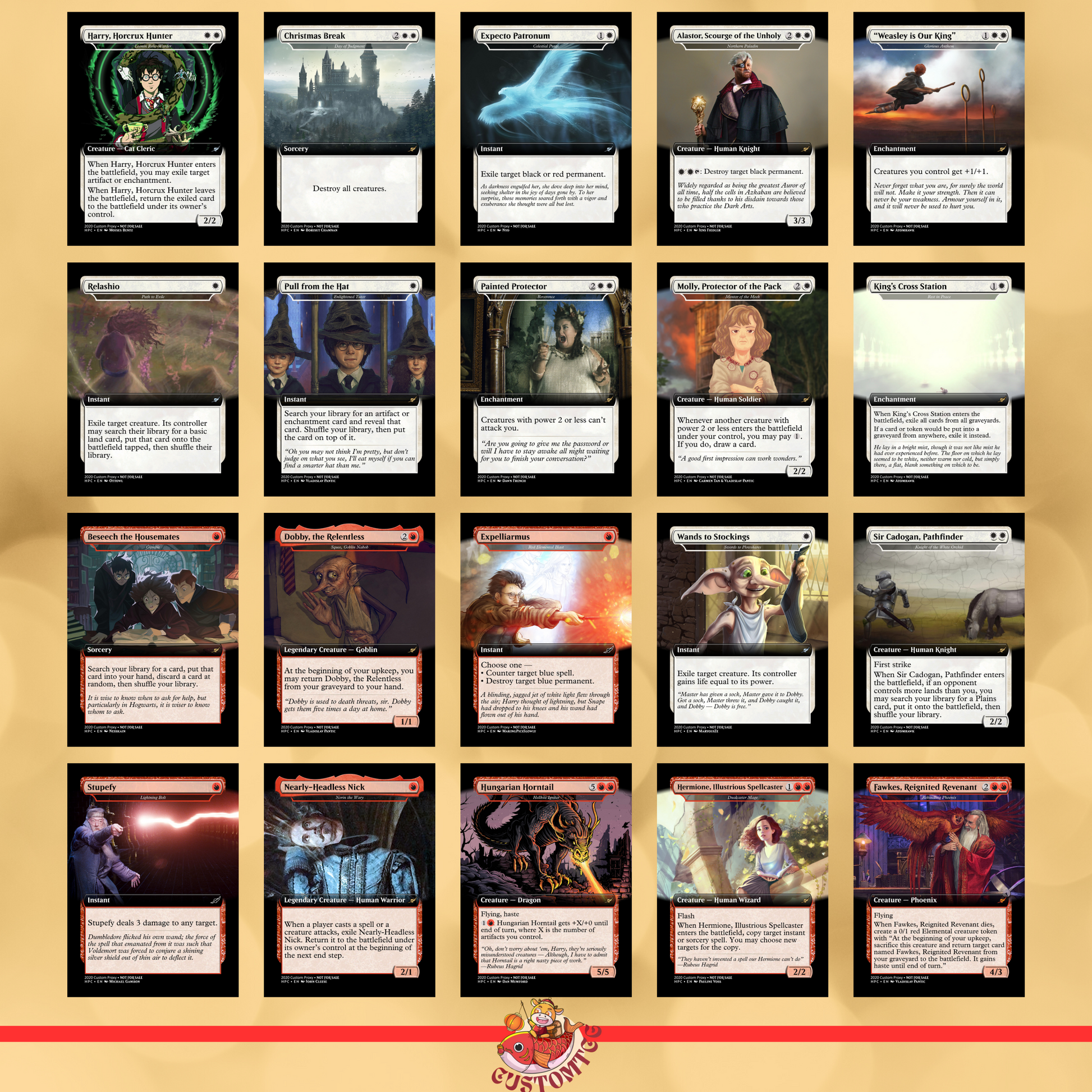 Our custom decks offer a truly unique experience, featuring fully frames, customized artwork, mana symbols, etc... designed to enhance the theme and style of each deck. Every card is meticulously crafted to provide a one-of-a-kind aesthetic while maintaining the quality you expect for seamless gameplay.