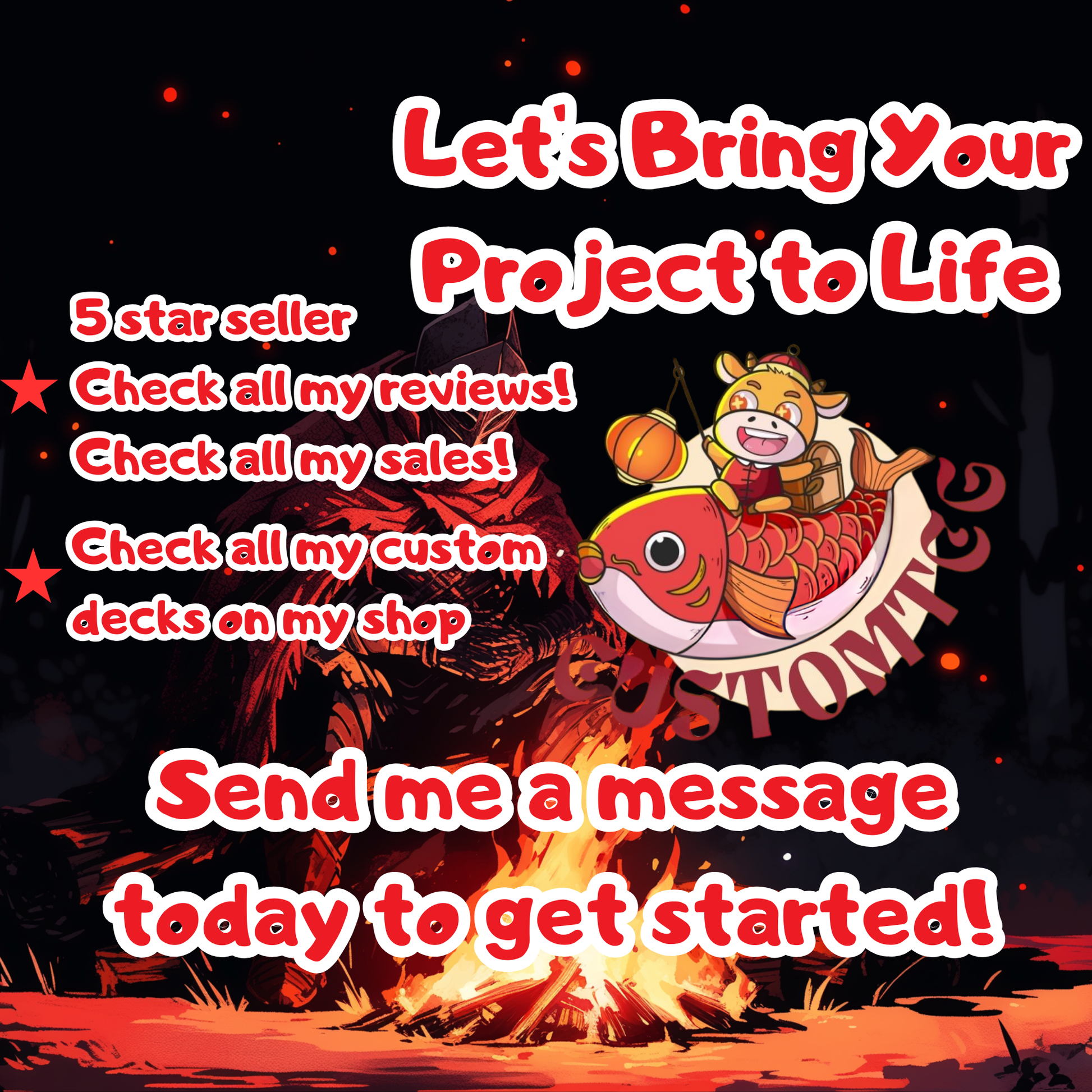 Our custom decks offer a truly unique experience, featuring fully frames, customized artwork, mana symbols, etc... designed to enhance the theme and style of each deck. Every card is meticulously crafted to provide a one-of-a-kind aesthetic while maintaining the quality you expect for seamless gameplay.