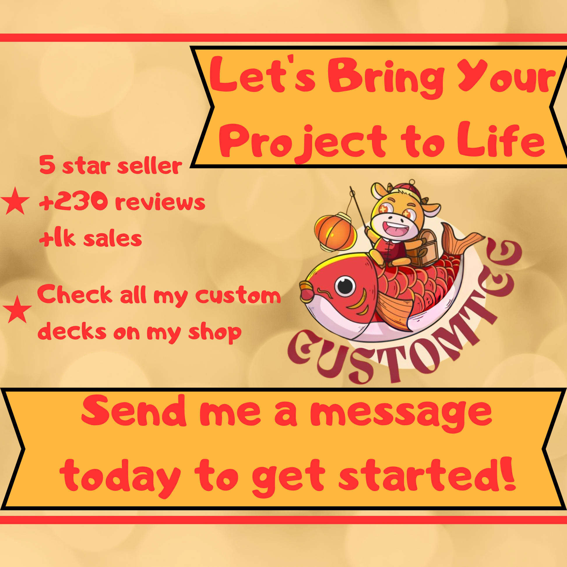 Our custom decks are crafted with exceptional quality to ensure durability and a premium feel. Each card is printed on highly resistant cardstock with vibrant colors that bring the artwork to life.