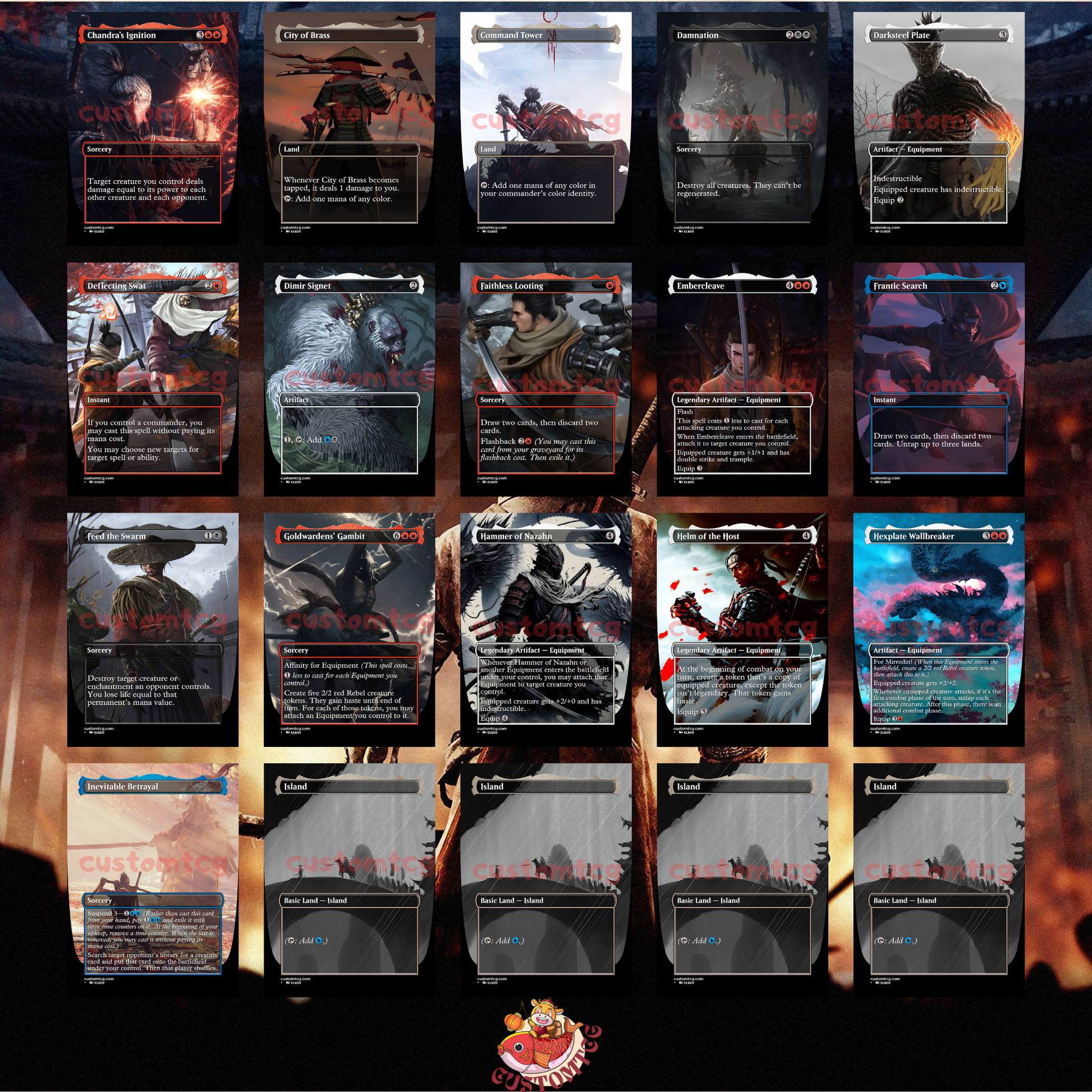 Our custom decks offer a truly unique experience, featuring fully frames, customized artwork, mana symbols, etc... designed to enhance the theme and style of each deck. Every card is meticulously crafted to provide a one-of-a-kind aesthetic while maintaining the quality you expect for seamless gameplay.