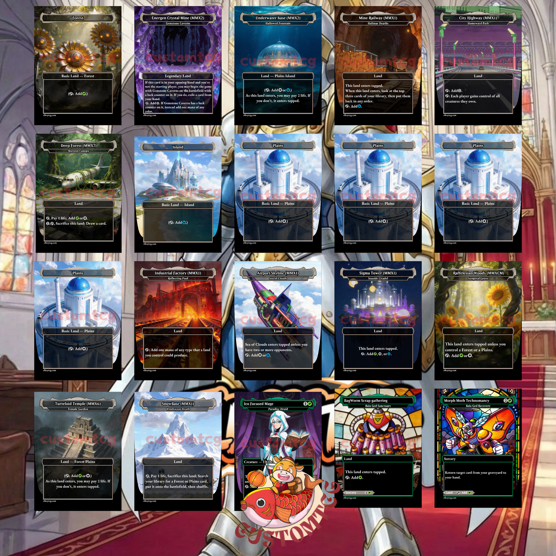 Our custom decks offer a truly unique experience, featuring fully frames, customized artwork, mana symbols, etc... designed to enhance the theme and style of each deck. Every card is meticulously crafted to provide a one-of-a-kind aesthetic while maintaining the quality you expect for seamless gameplay.