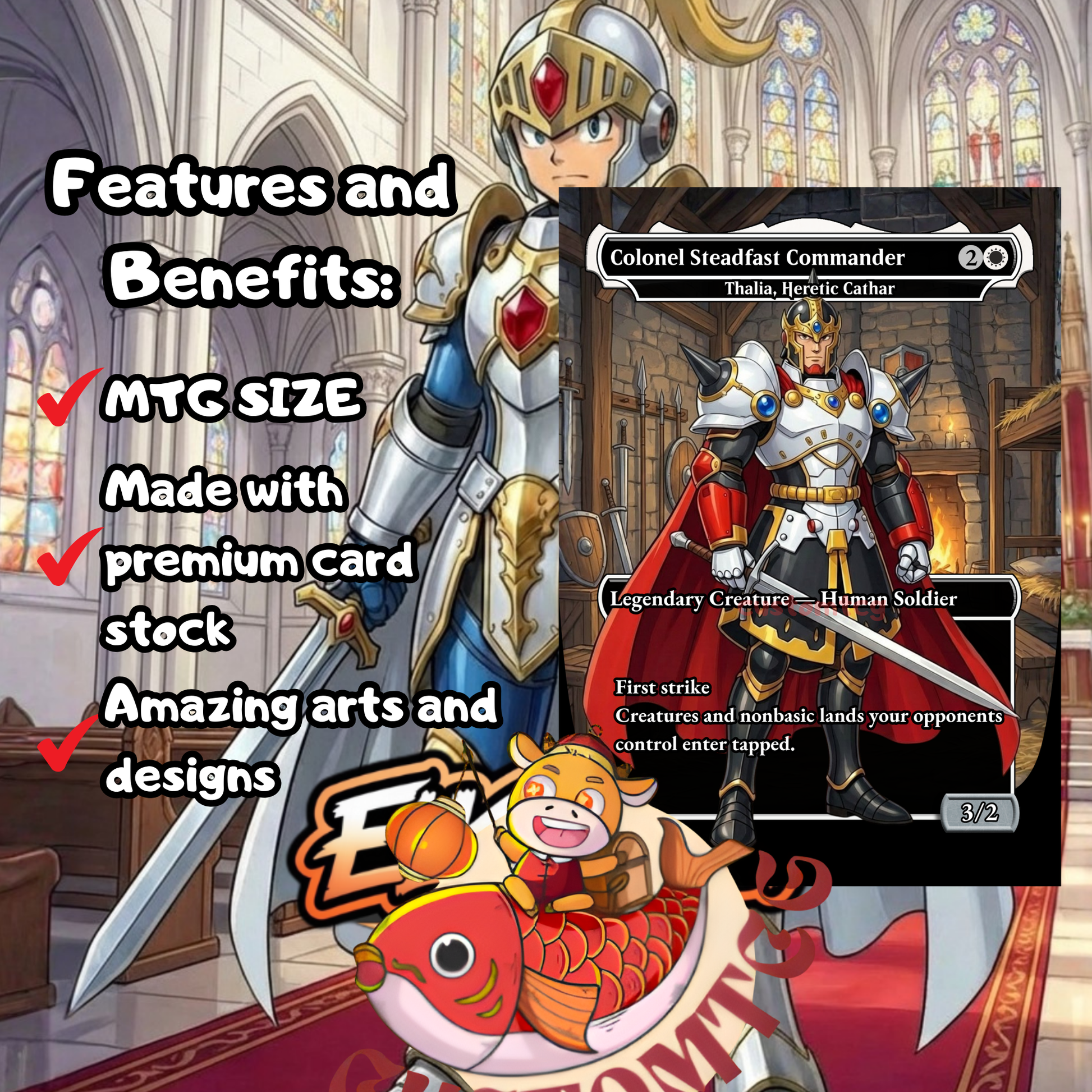 Our custom Commander decks are made in the standard card size and has rounded corners, ensuring compatibility with your collection and accessories. Measuring 63mm x 88mm (2.5” x 3.5”), these cards are designed to fit seamlessly into sleeves, deck boxes, and shuffling routines.🌟