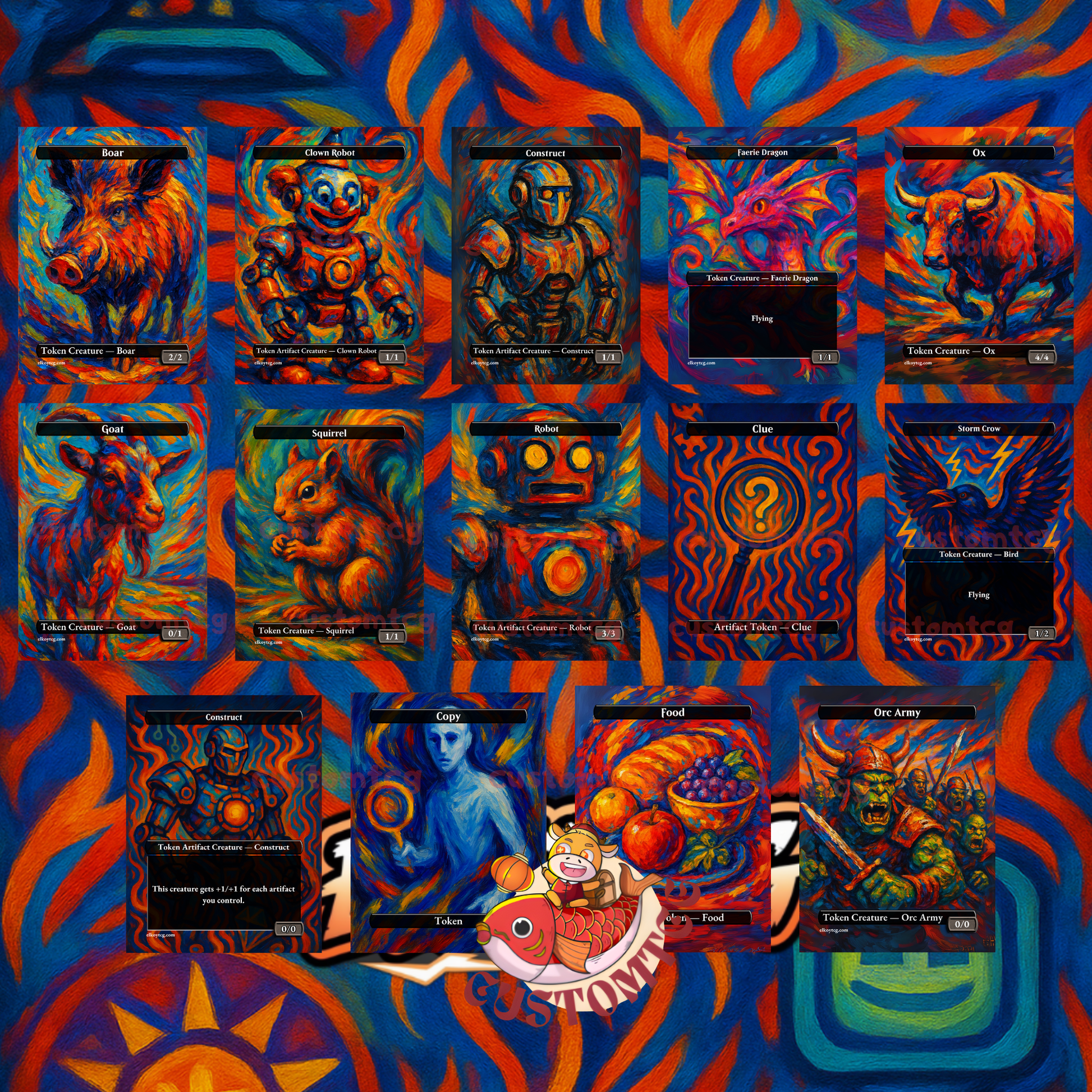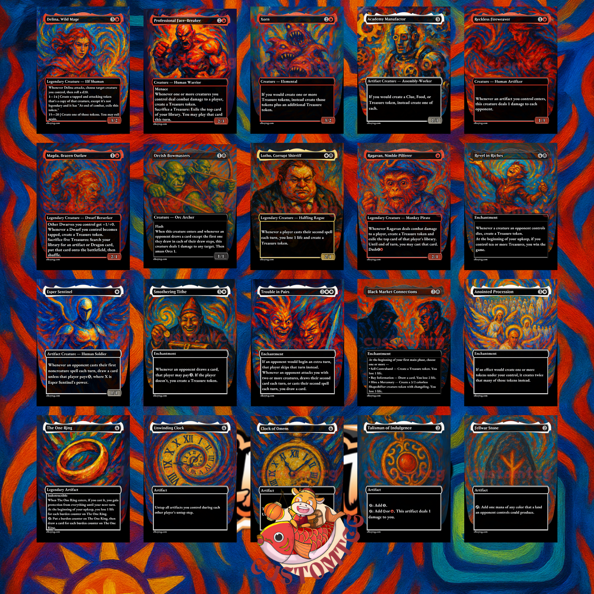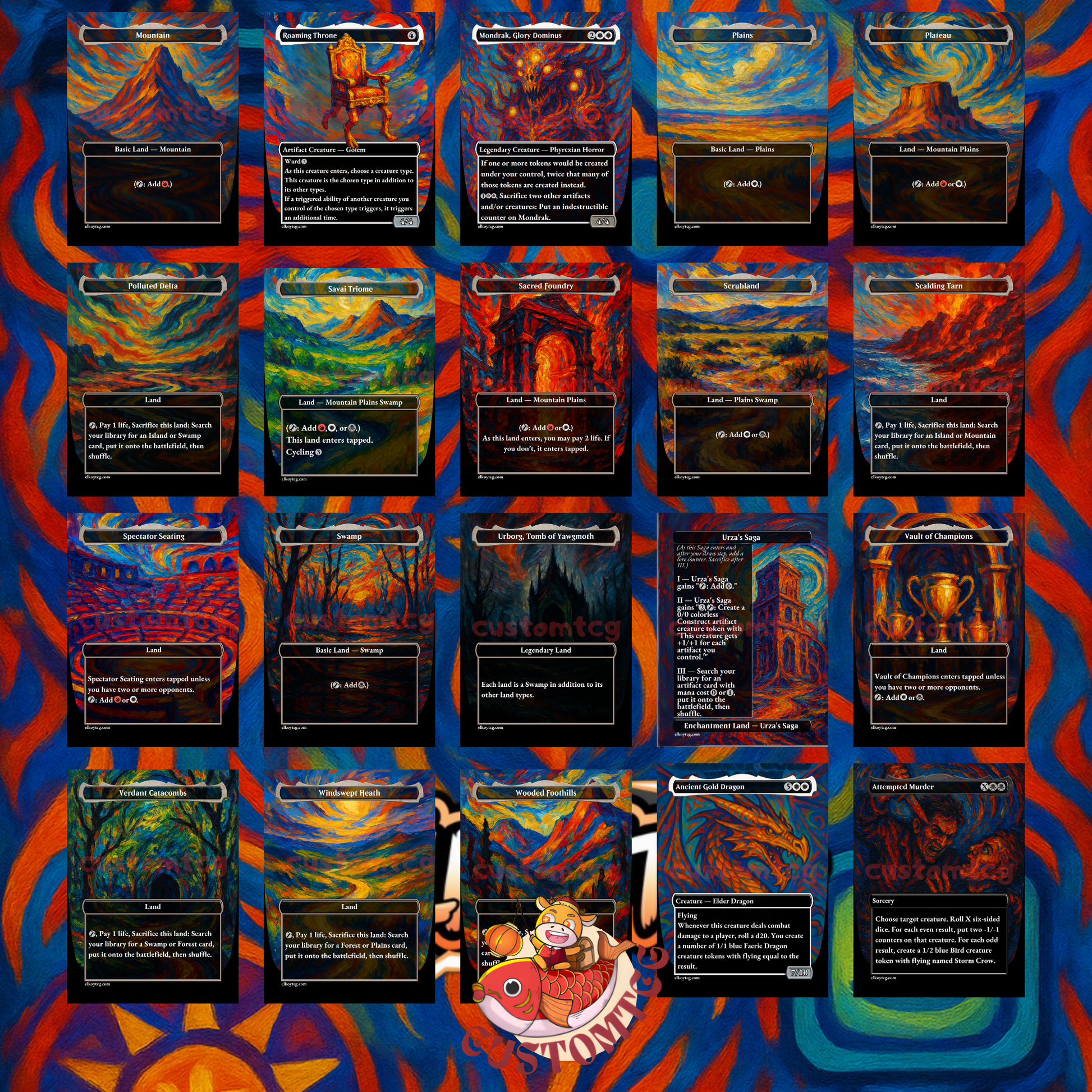 Our custom decks offer a truly unique experience, featuring fully frames, customized artwork, mana symbols, etc... designed to enhance the theme and style of each deck. Every card is meticulously crafted to provide a one-of-a-kind aesthetic while maintaining the quality you expect for seamless gameplay.