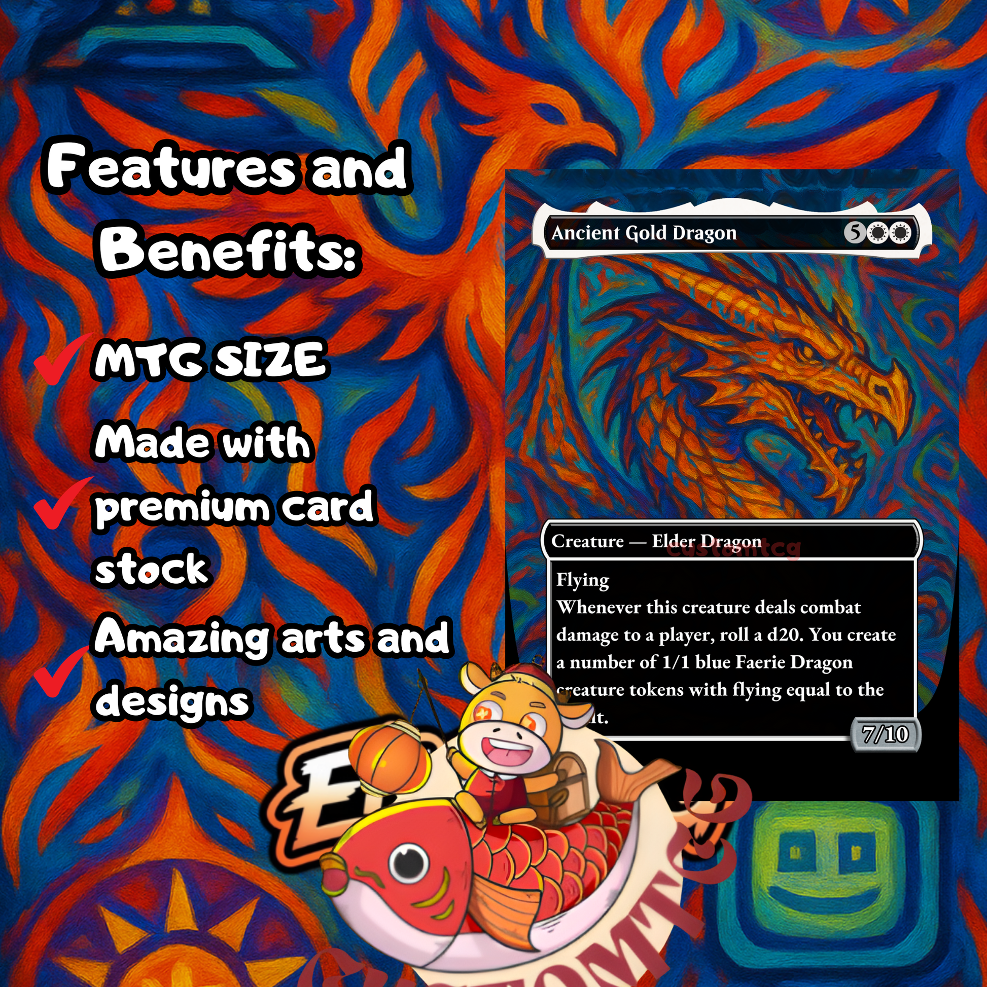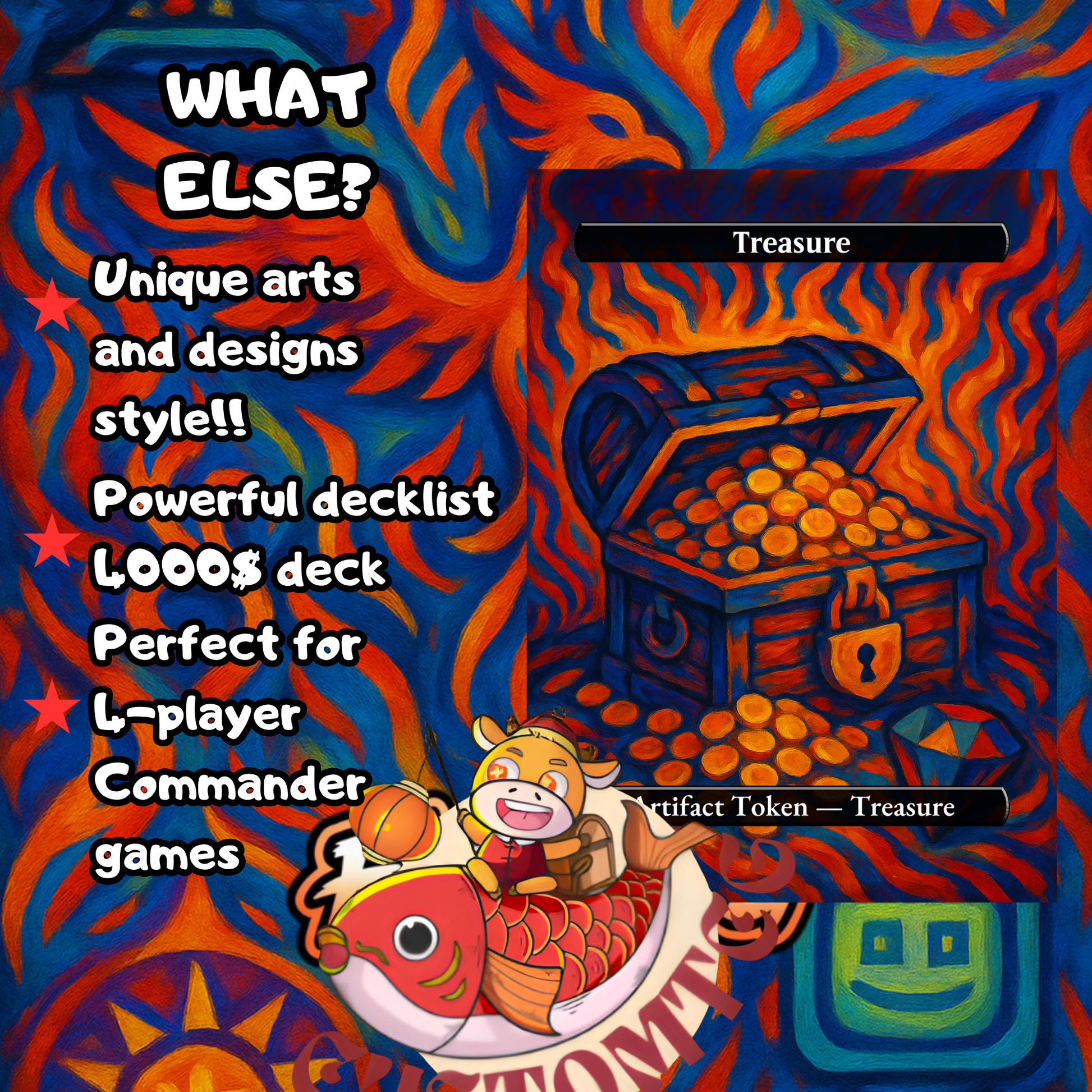 Our custom Commander decks are made in the standard card size and has rounded corners, ensuring compatibility with your collection and accessories. Measuring 63mm x 88mm (2.5” x 3.5”), these cards are designed to fit seamlessly into sleeves, deck boxes, and shuffling routines.🌟