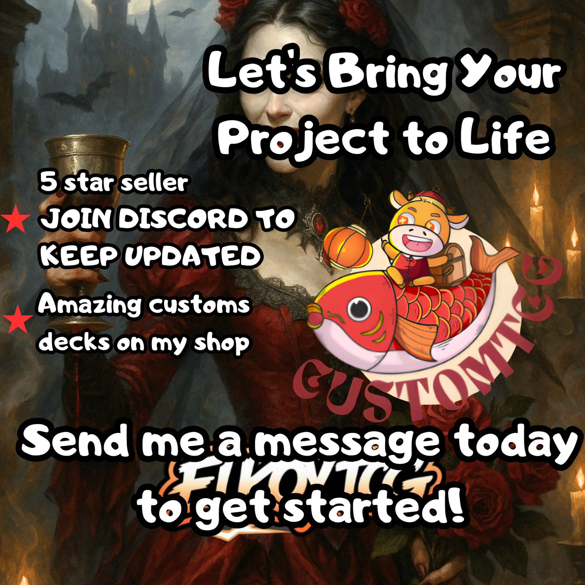 Our custom decks offer a truly unique experience, featuring fully frames, customized artwork, mana symbols, etc... designed to enhance the theme and style of each deck. Every card is meticulously crafted to provide a one-of-a-kind aesthetic while maintaining the quality you expect for seamless gameplay.