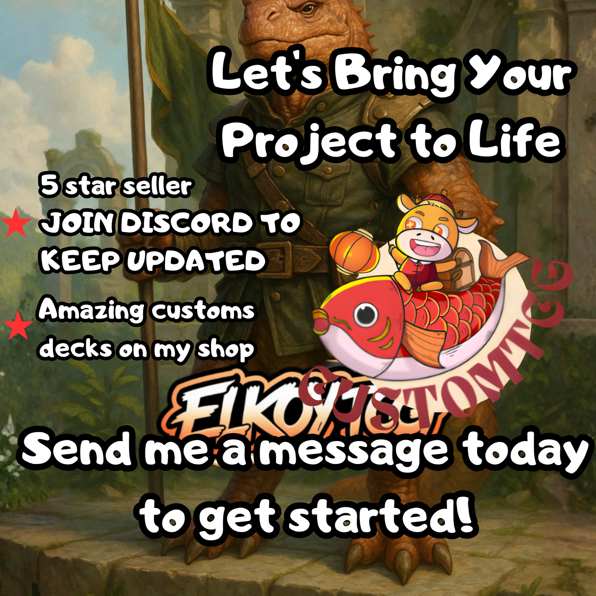 Our custom decks offer a truly unique experience, featuring fully frames, customized artwork, mana symbols, etc... designed to enhance the theme and style of each deck. Every card is meticulously crafted to provide a one-of-a-kind aesthetic while maintaining the quality you expect for seamless gameplay.