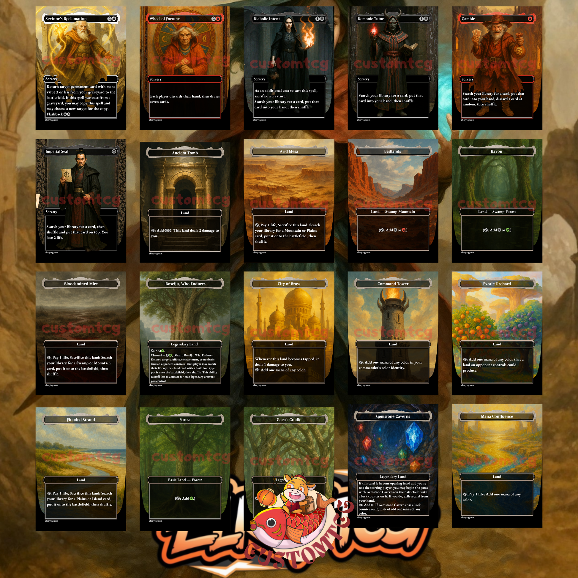 Our custom decks offer a truly unique experience, featuring fully frames, customized artwork, mana symbols, etc... designed to enhance the theme and style of each deck. Every card is meticulously crafted to provide a one-of-a-kind aesthetic while maintaining the quality you expect for seamless gameplay.