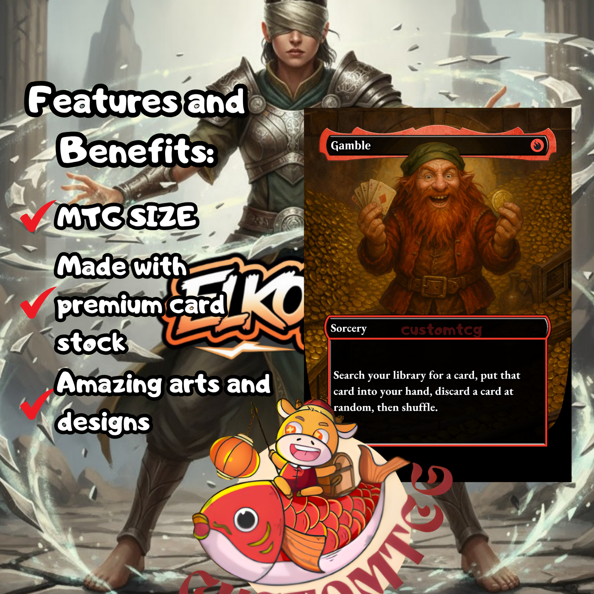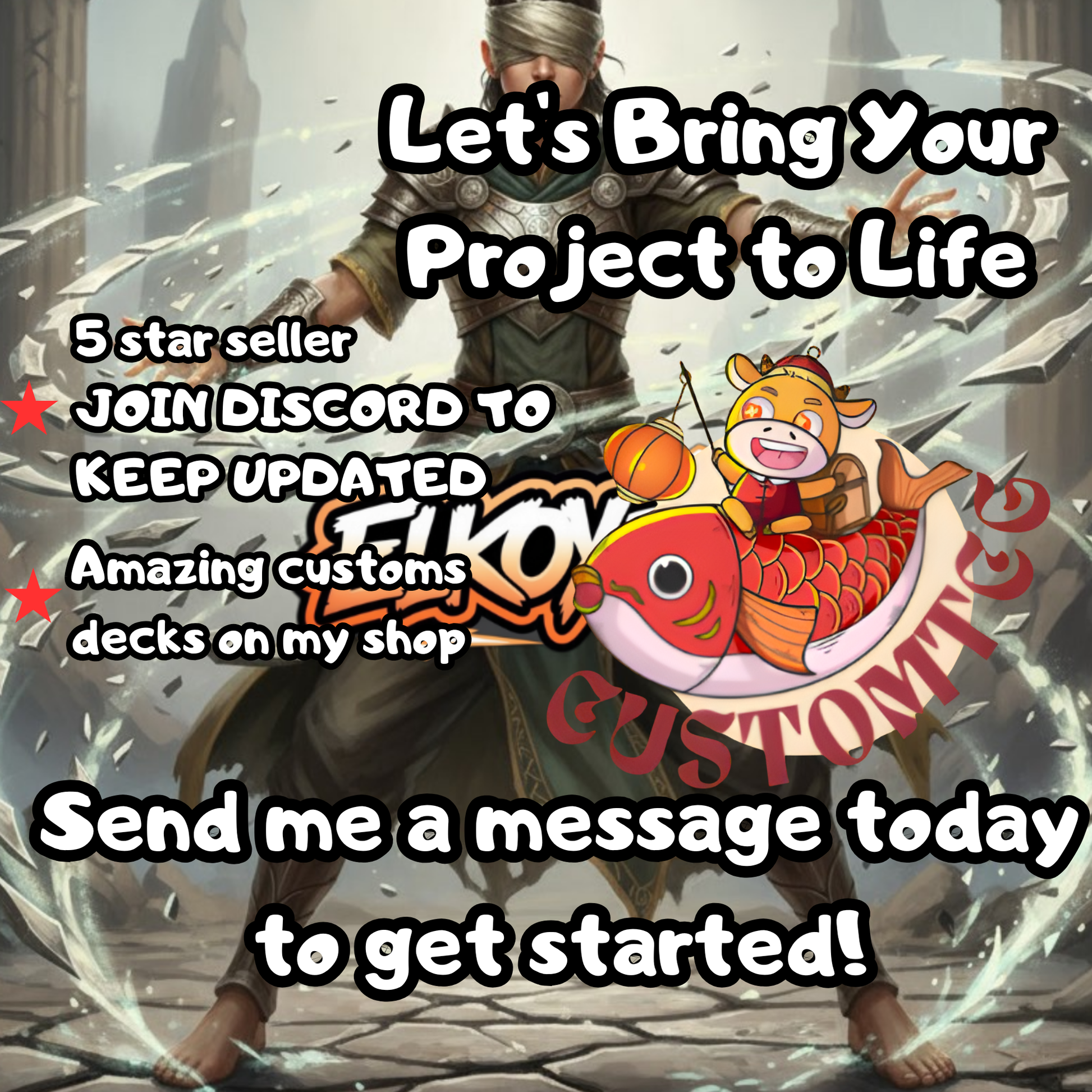 Our custom decks offer a truly unique experience, featuring fully frames, customized artwork, mana symbols, etc... designed to enhance the theme and style of each deck. Every card is meticulously crafted to provide a one-of-a-kind aesthetic while maintaining the quality you expect for seamless gameplay.