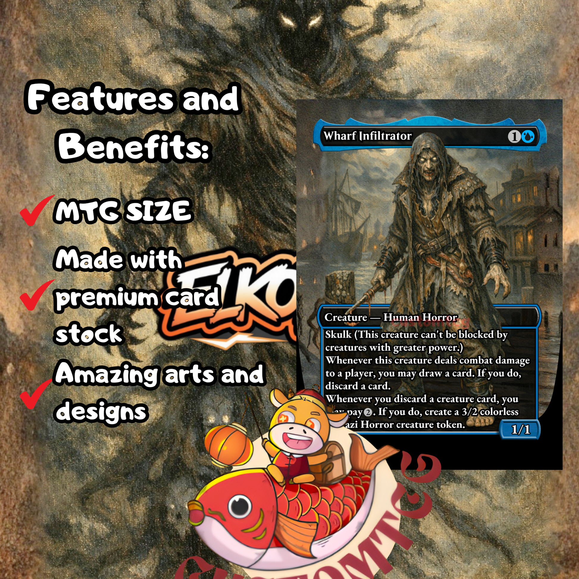Our custom decks offer a truly unique experience, featuring fully frames, customized artwork, mana symbols, etc... designed to enhance the theme and style of each deck. Every card is meticulously crafted to provide a one-of-a-kind aesthetic while maintaining the quality you expect for seamless gameplay.
