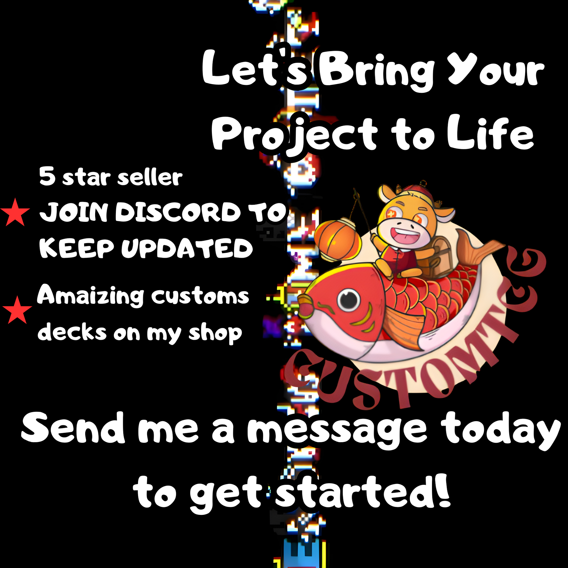 Our custom decks offer a truly unique experience, featuring fully frames, customized artwork, mana symbols, etc... designed to enhance the theme and style of each deck. Every card is meticulously crafted to provide a one-of-a-kind aesthetic while maintaining the quality you expect for seamless gameplay.