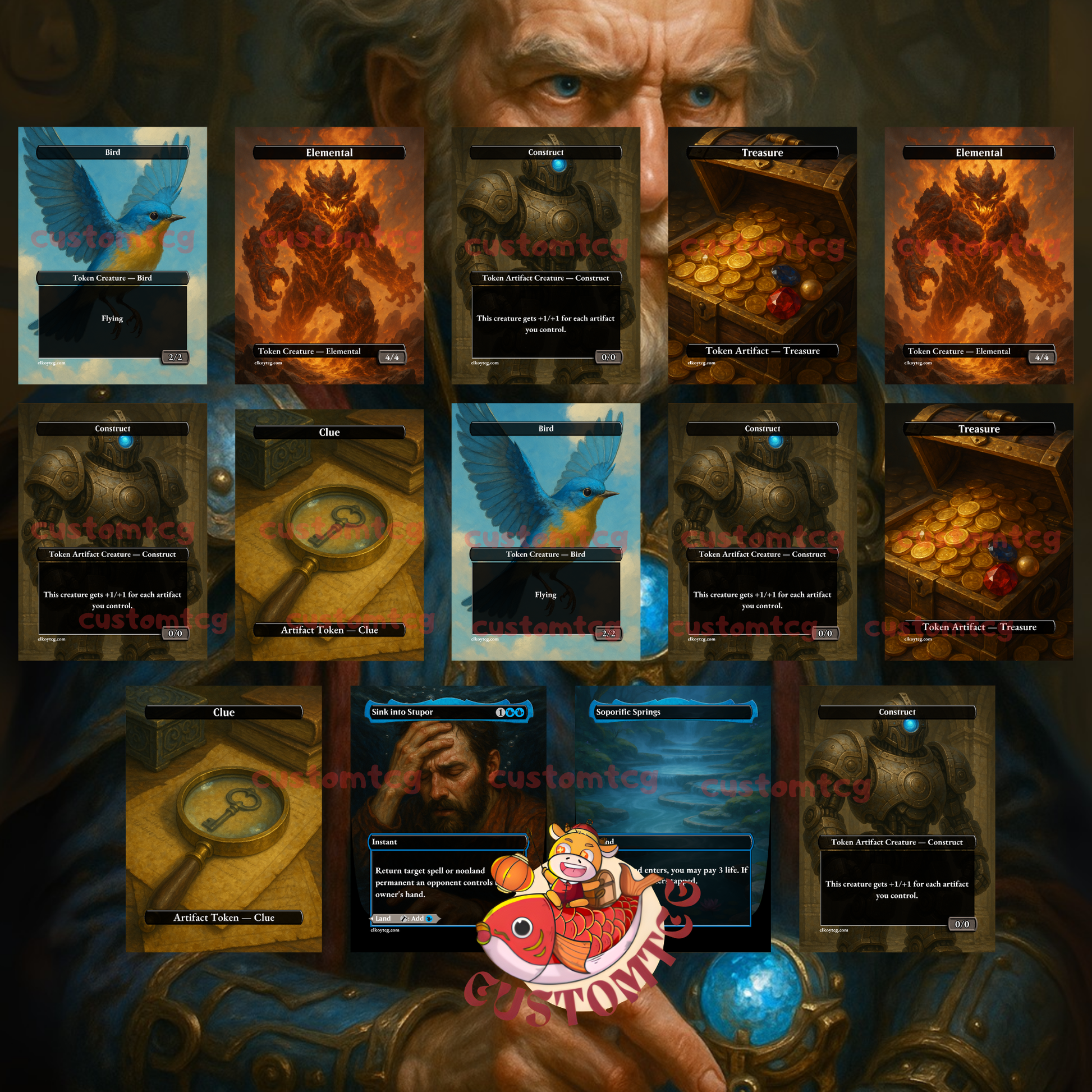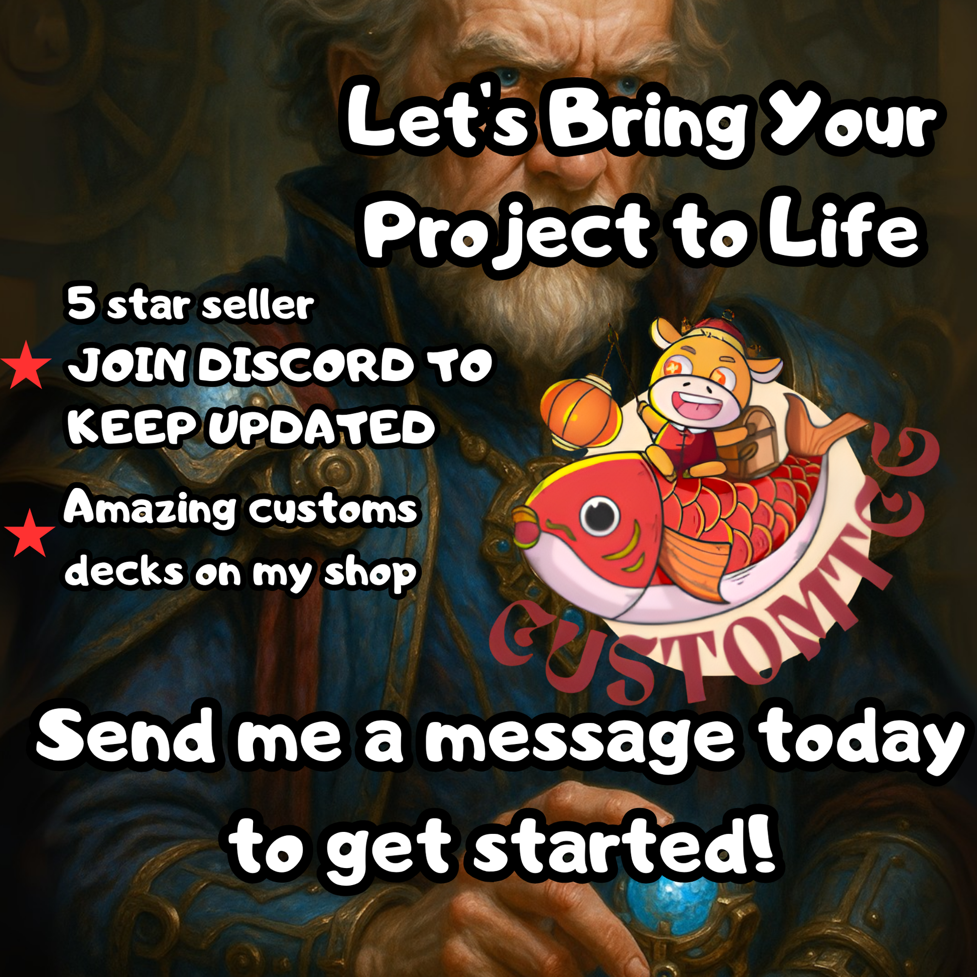Our custom decks offer a truly unique experience, featuring fully frames, customized artwork, mana symbols, etc... designed to enhance the theme and style of each deck. Every card is meticulously crafted to provide a one-of-a-kind aesthetic while maintaining the quality you expect for seamless gameplay.