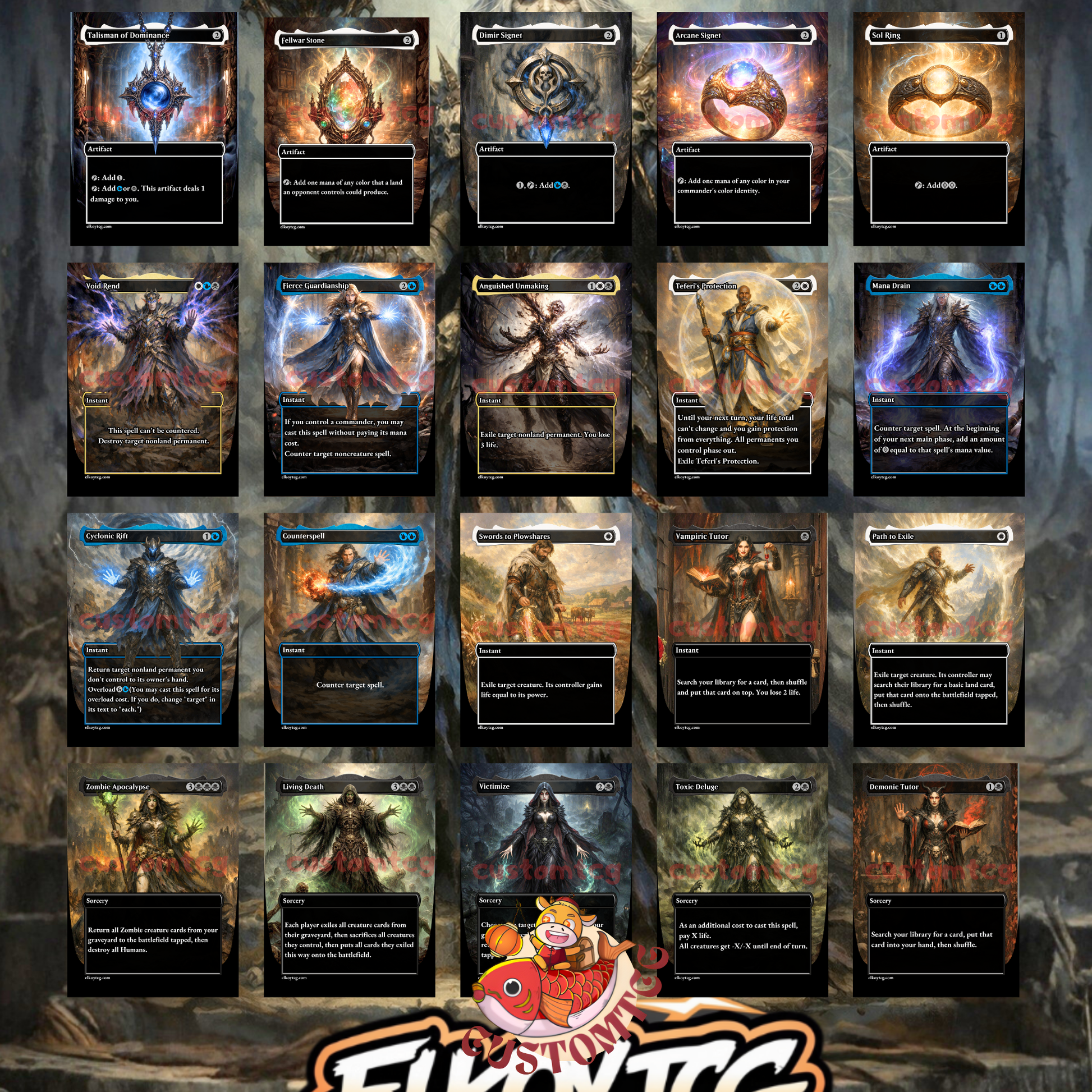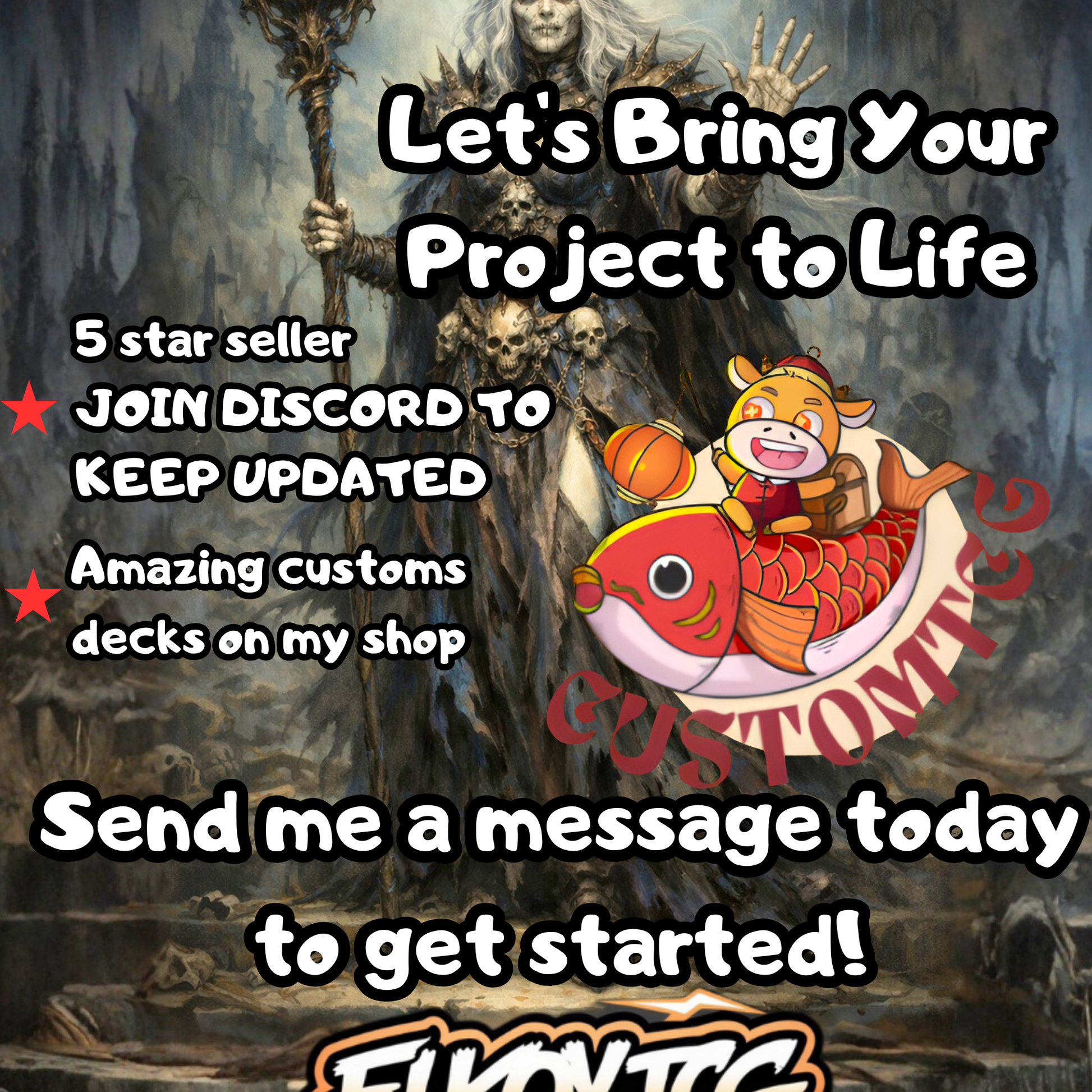 Our custom decks offer a truly unique experience, featuring fully frames, customized artwork, mana symbols, etc... designed to enhance the theme and style of each deck. Every card is meticulously crafted to provide a one-of-a-kind aesthetic while maintaining the quality you expect for seamless gameplay.