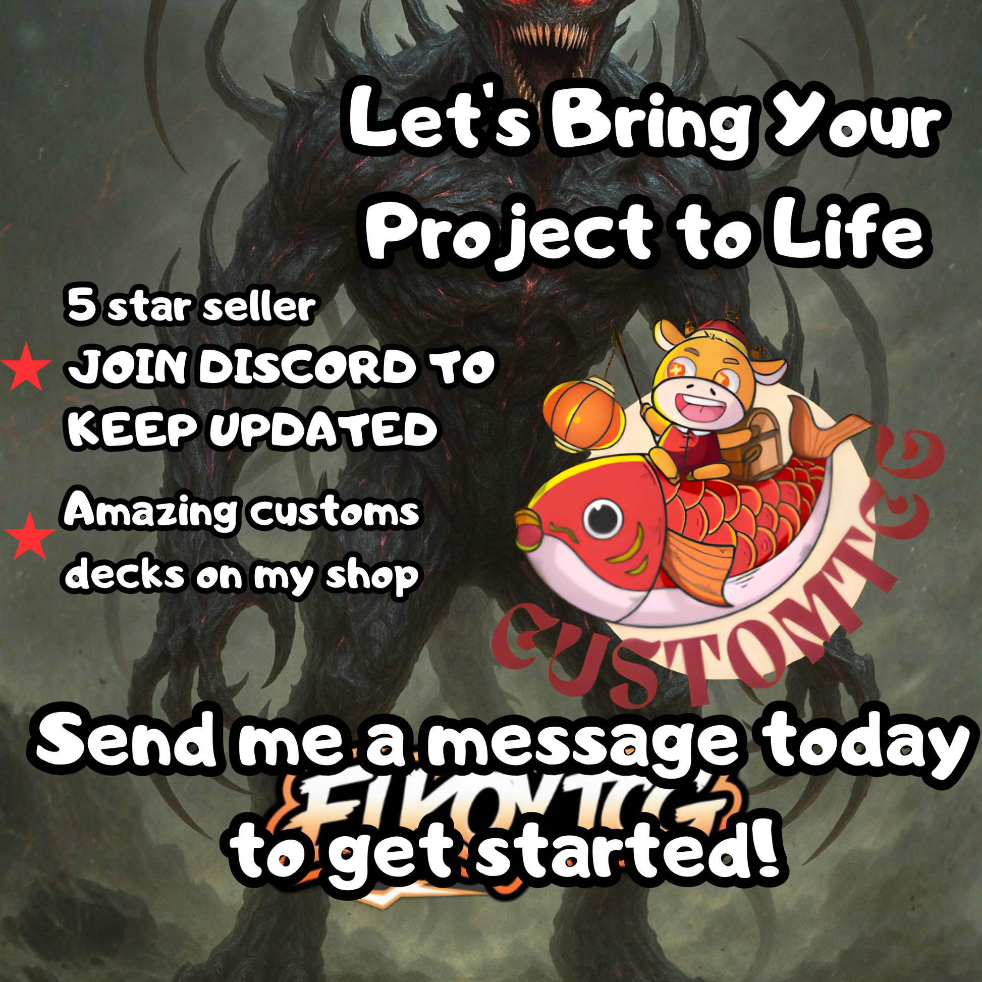 Our custom decks offer a truly unique experience, featuring fully frames, customized artwork, mana symbols, etc... designed to enhance the theme and style of each deck. Every card is meticulously crafted to provide a one-of-a-kind aesthetic while maintaining the quality you expect for seamless gameplay.