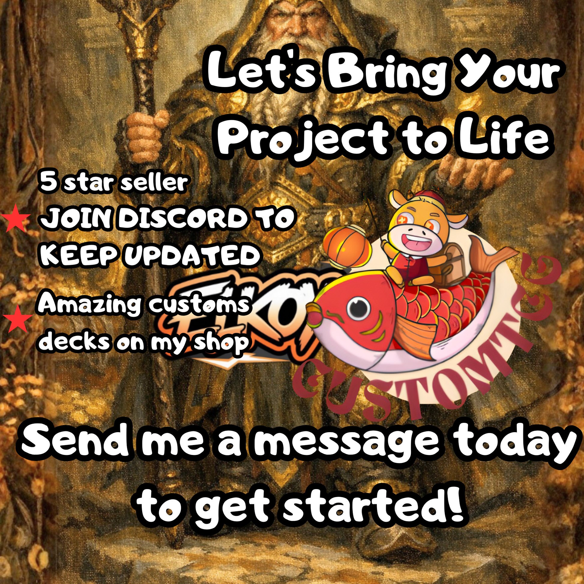 Our custom decks offer a truly unique experience, featuring fully frames, customized artwork, mana symbols, etc... designed to enhance the theme and style of each deck. Every card is meticulously crafted to provide a one-of-a-kind aesthetic while maintaining the quality you expect for seamless gameplay.
